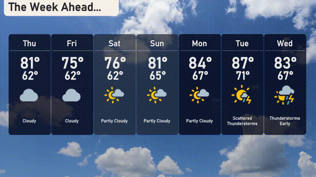 Thursday: Cloudy, with a high of 81 degrees and a low of 62 degrees.
