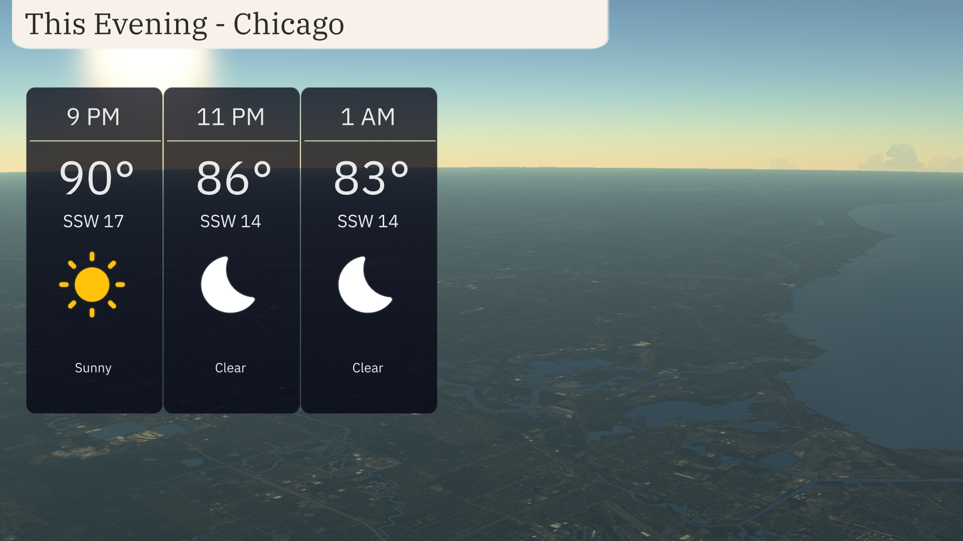 Evening temperatures in Chicago start at a warm 90 degrees by 9 PM, with clear skies and a gentle breeze from the south-southwest at 17 miles per hour. By 11 PM, temperatures ease slightly to 86 degrees, as skies remain clear. The gentle breeze continues, maintaining a steady 14 miles per hour from the south-southwest. Overnight at 1 AM, temperatures settle at 83 degrees under perfectly clear skies.