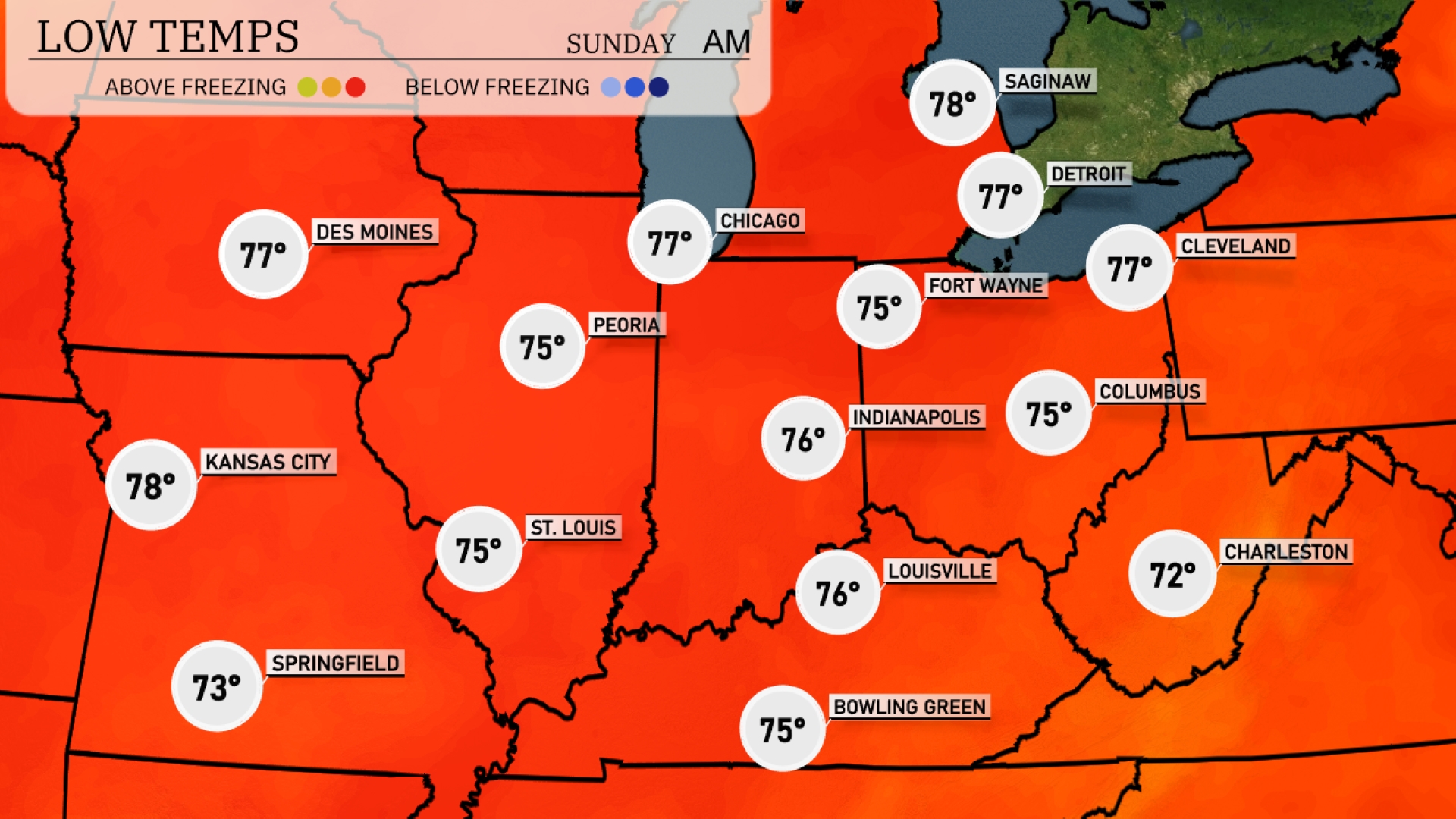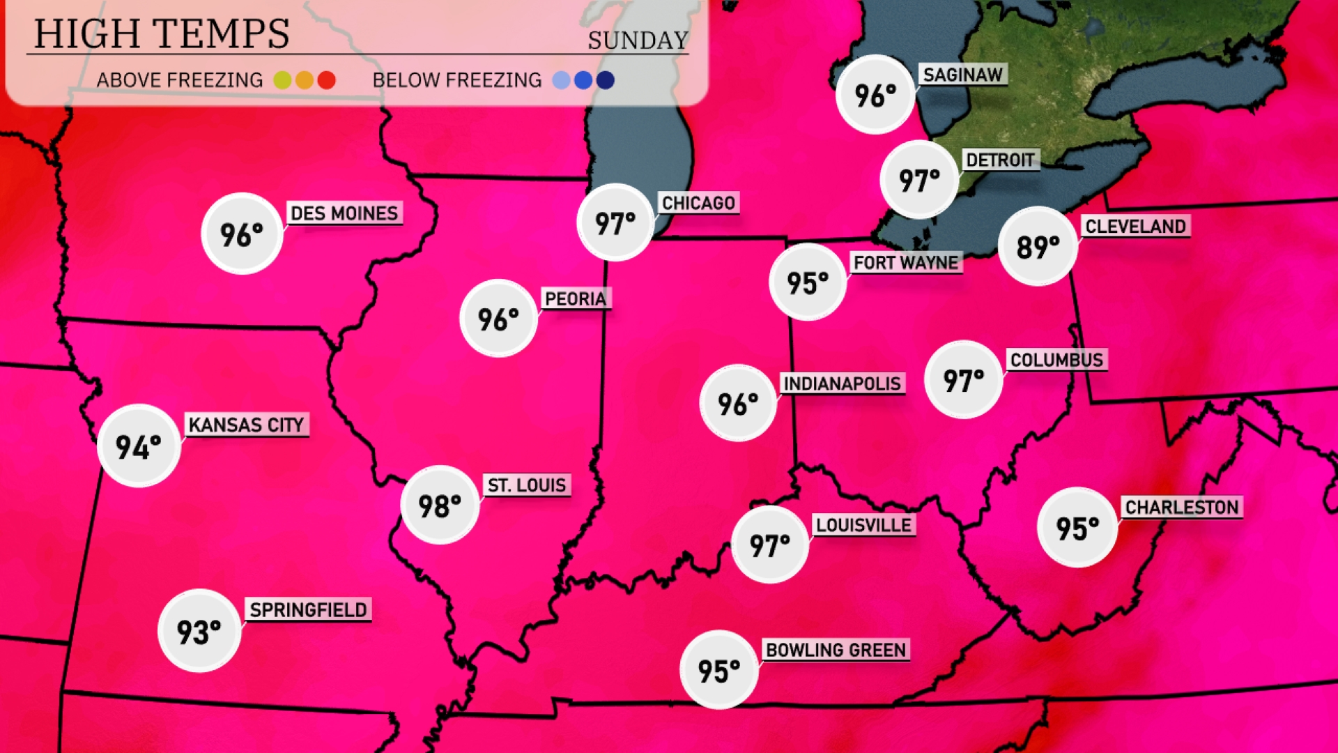Tomorrow, Chicago will see a high of 97 degrees, while Indianapolis and Fort Wayne will both reach 96. In Louisville, temperatures will rise to 97, and in Peoria, expect a high of 98. Kansas City is forecasted for a warm 94 degrees, with Springfield slightly cooler at 93.