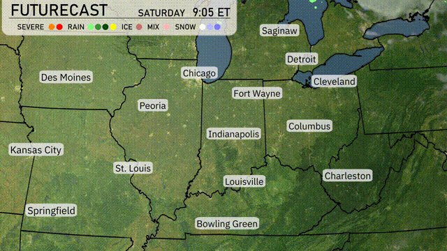 Storms are concentrated over the northern Midwest, with severe weather impacting areas near Saginaw, Michigan. Rain showers are extending towards Detroit and Cleveland, creating a rainy morning in these areas. Chicago, Des Moines, and St. Louis are under clear skies, making for a pleasant start to the day. Indianapolis and Columbus are currently experiencing cloud cover, but no precipitation is evident at this time.