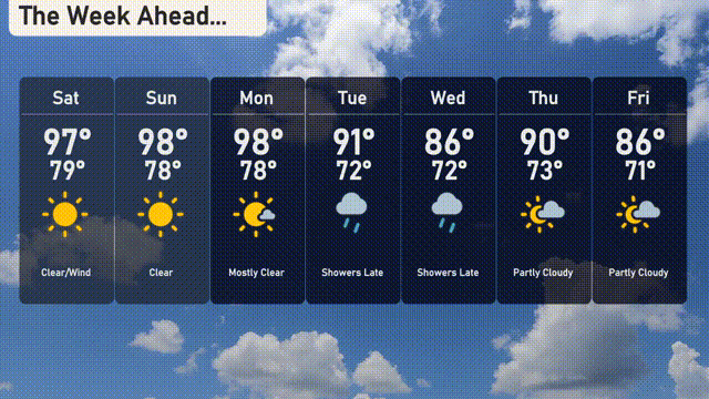 Sunday: Sunny and clear again, reaching up to 98 degrees and a low of 78 degrees.