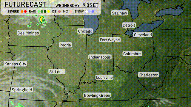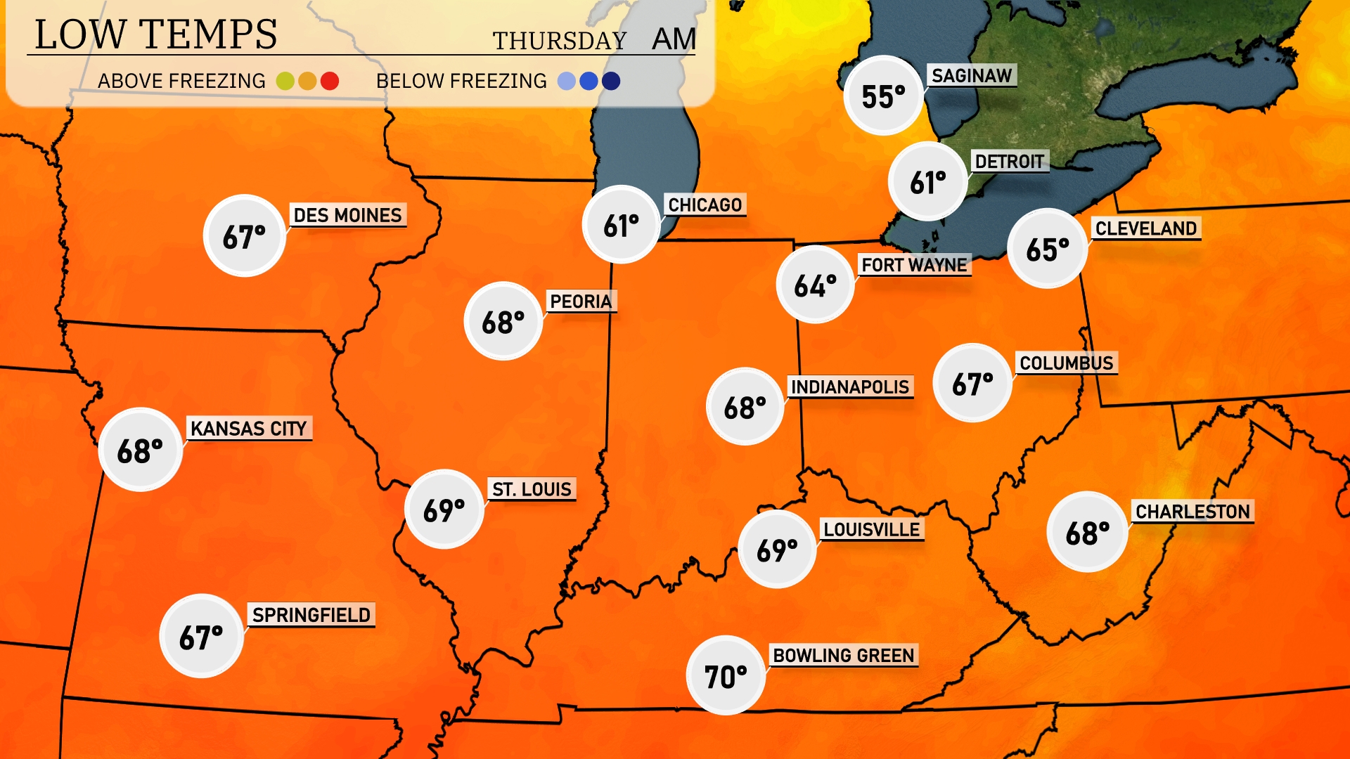 Tonight, Chicago will cool down to 61 degrees, while Fort Wayne dips to 64. Indianapolis is expected to see a low of 68. In contrast, temperatures in cities like Kansas City and Springfield will remain warmer at 68 and 67 degrees respectively.