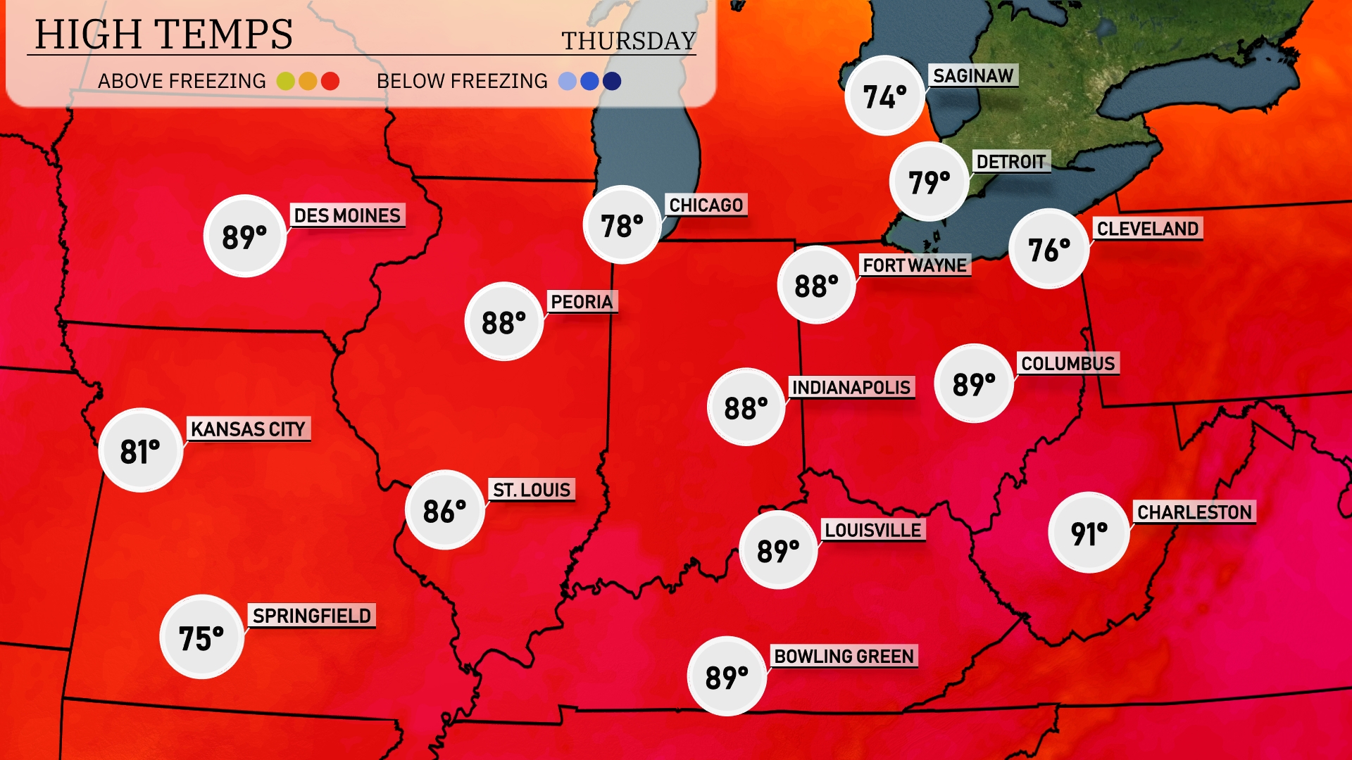 Tomorrow, high temperatures in the Midwest will soar, with Indianapolis and Louisville both reaching a warm 89 degrees. Chicago will see a pleasant high of 78, while Kansas City will warm up to 81. Temperatures are well above average for this time of year, with highs peaking at 91 in Charleston