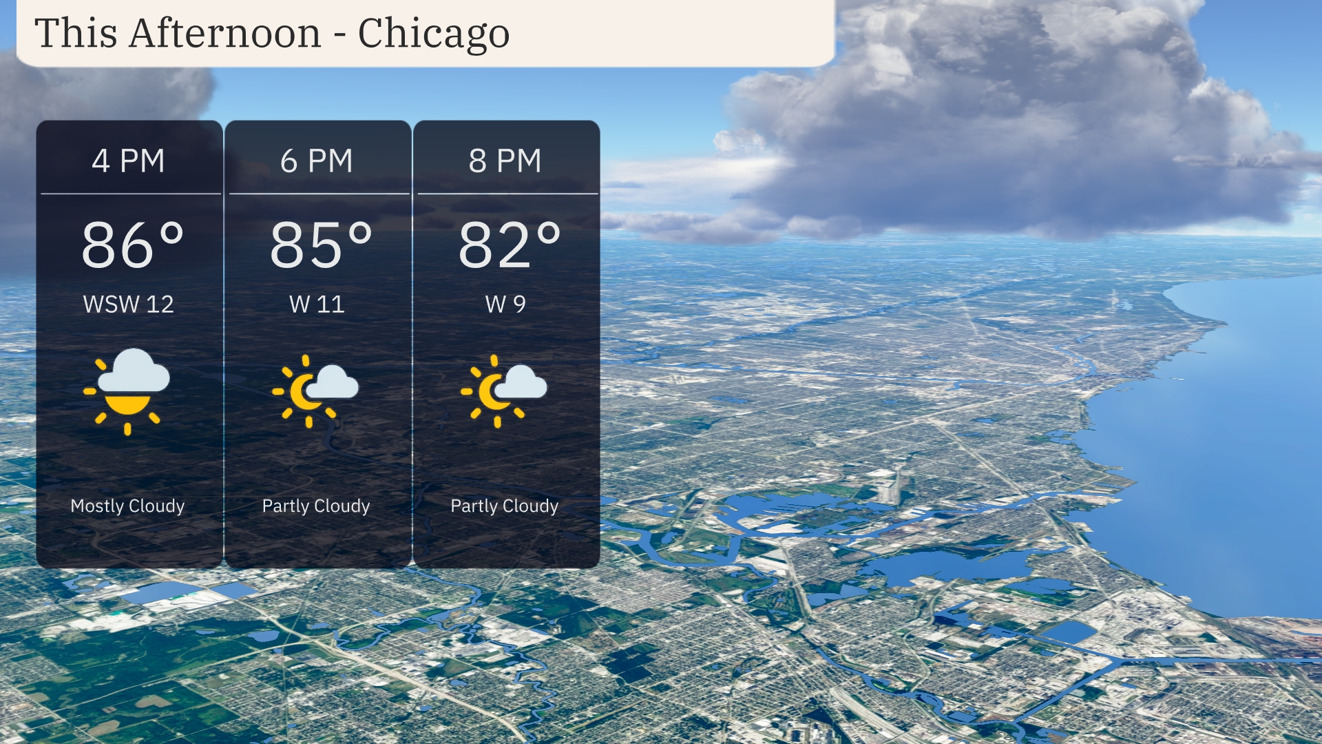 This afternoon in Chicago, temperatures will reach a warm 86 degrees by 4 PM, cooling slightly to 82 degrees by 8 PM. Expect mostly cloudy skies transitioning to partly cloudy conditions later in the day. Winds will be coming from the west-southwest at 12 miles per hour, decreasing to 9 miles per hour by the evening.