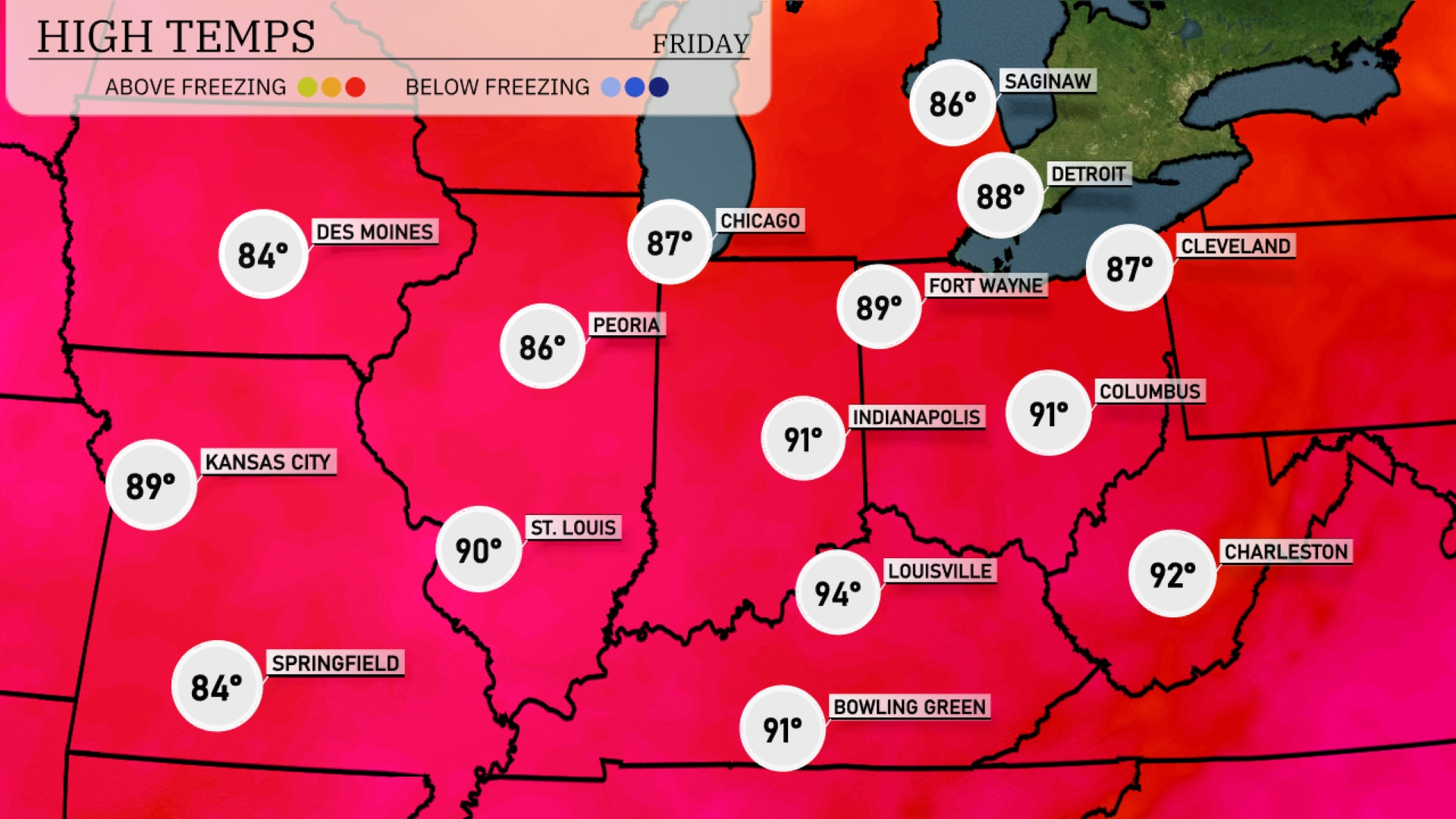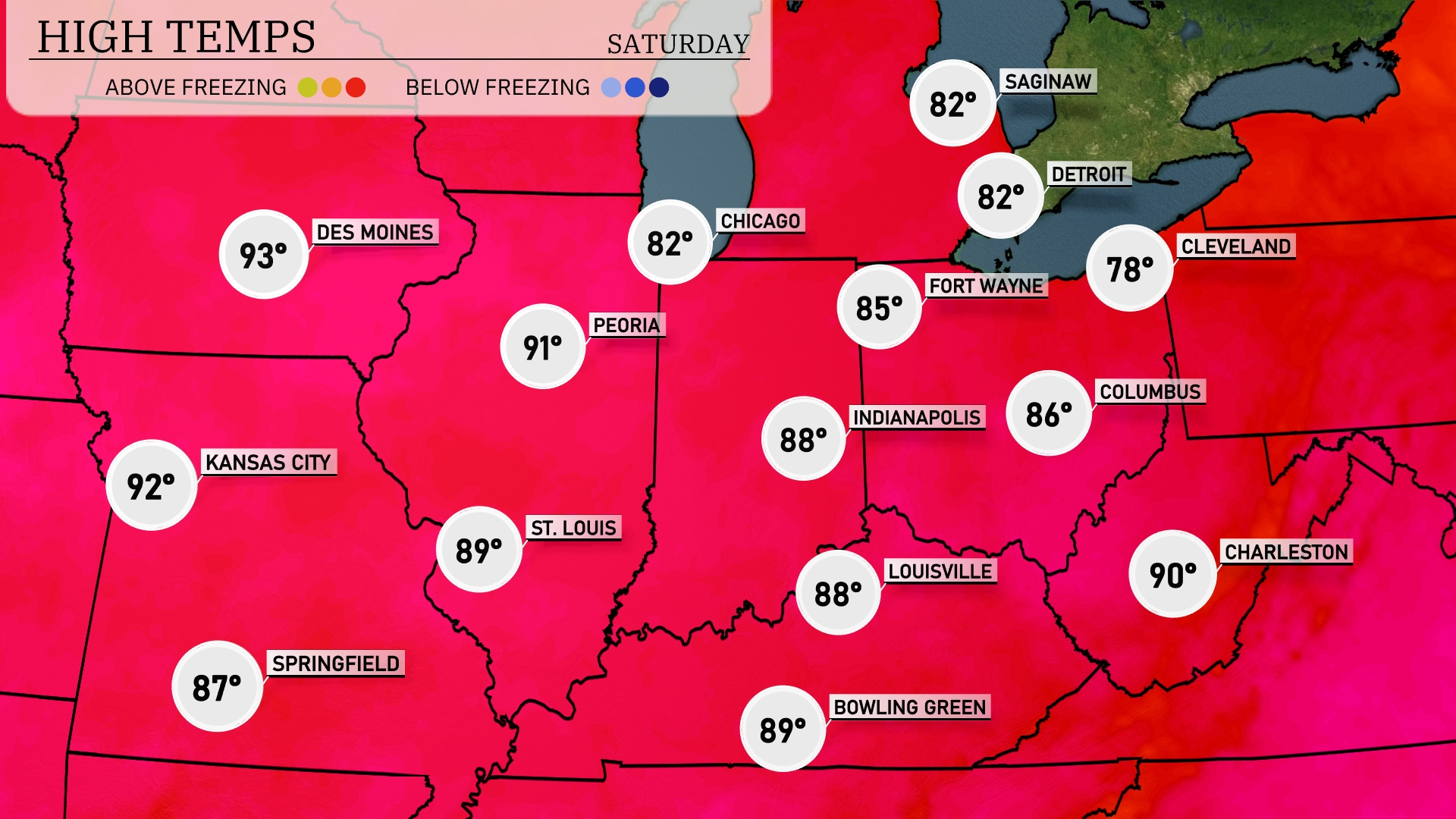 Tomorrow, high temperatures in the Midwest will soar, with Des Moines leading the way at a sizzling 93 degrees. Kansas City will see a high of 92, while Springfield reaches a warm 87 degrees. In southern Indiana, Indianapolis is expected to hit 88 degrees, closely followed by Louisville at 88 as well. Columbus will remain cooler, peaking at 78 degrees, influenced by a passing front.