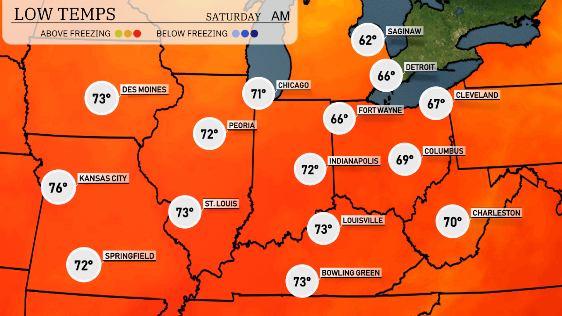 Tonight in the Midwest, temperatures will be quite mild. Chicago and Indianapolis are both expected to cool to 72 degrees, while Des Moines will settle at a warm 73 degrees. Kansas City will be slightly cooler at 76 degrees. Moving east, Columbus will hit 69 degrees, with Louisville not far behind at 73 degrees.