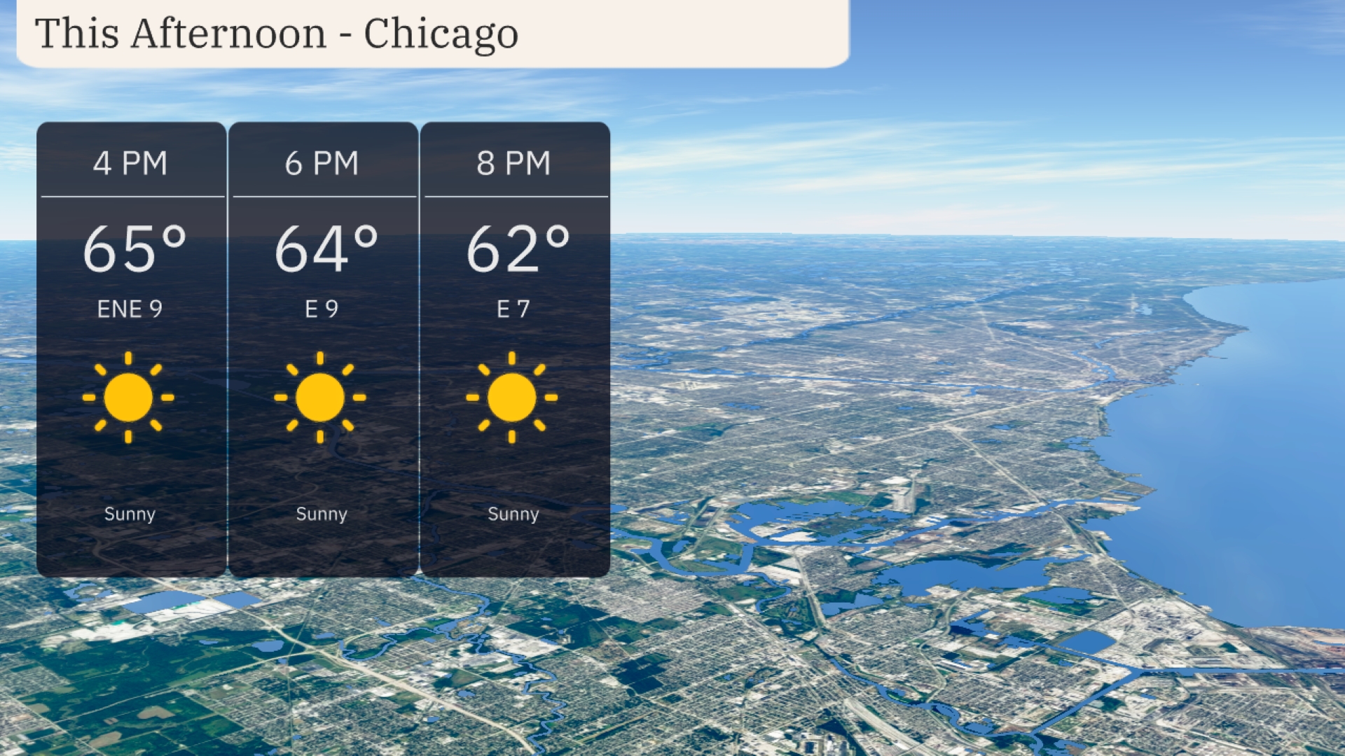 Chicago remains sunny this afternoon with temperatures peaking at 65 degrees around 4 PM. Expect a gentle east-northeast breeze at 9 miles per hour, providing a comfortable feel. As the evening progresses, temperatures will slightly drop to 62 degrees by 8 PM with the winds settling at 7 miles per hour from the east.