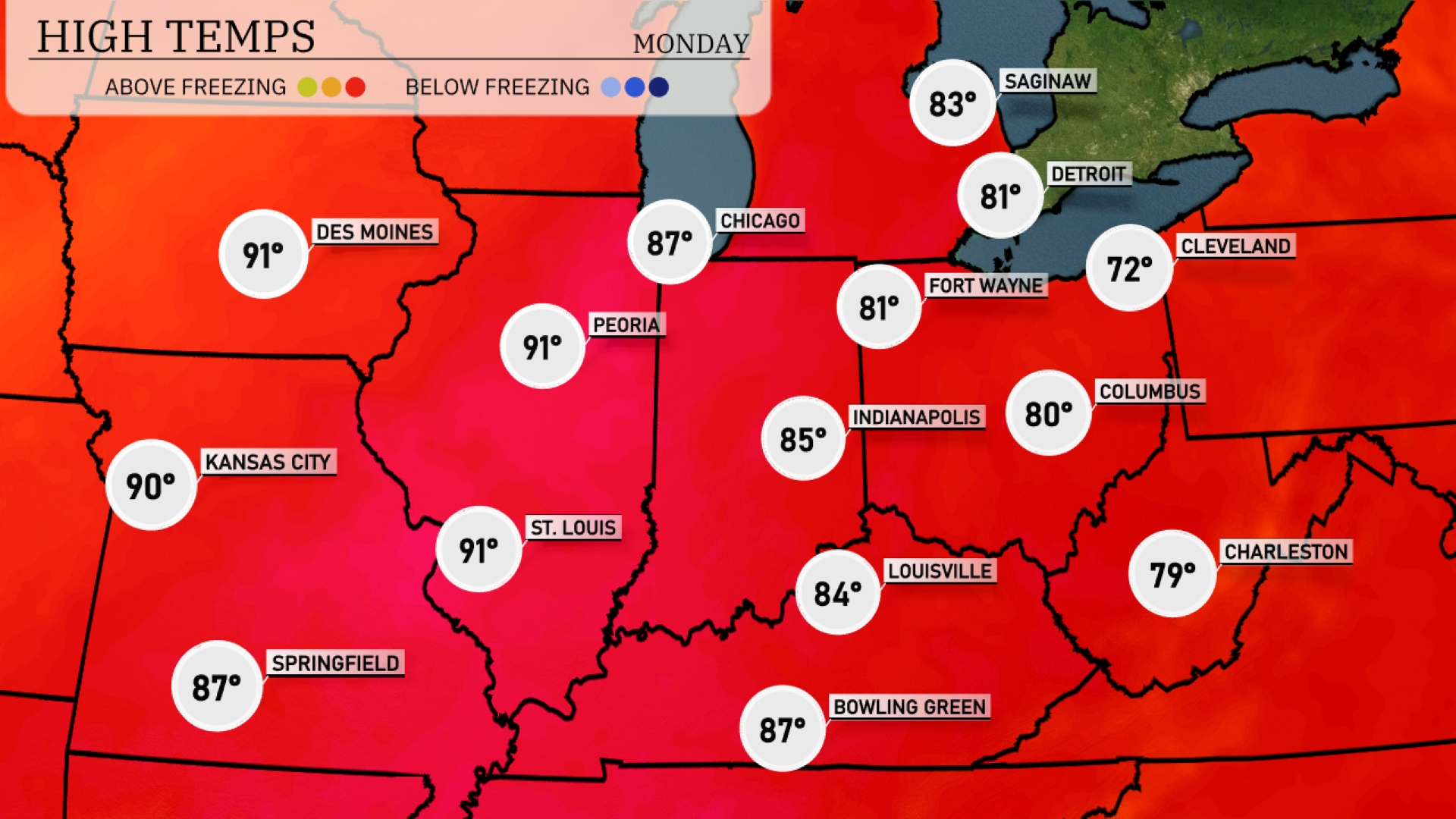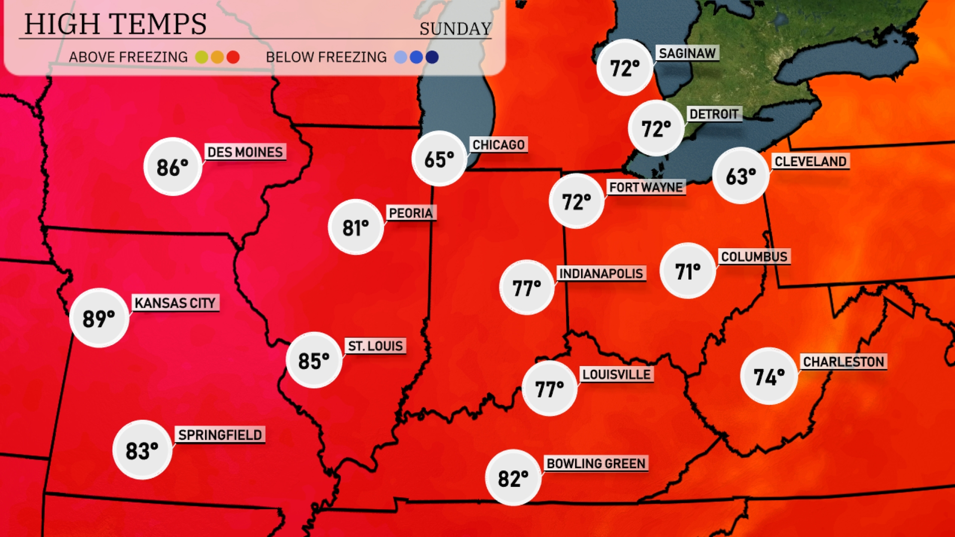 Today Kansas City is heating up with a high of 89 degrees, while St. Louis is a bit cooler at 85 degrees. In Indiana, Indianapolis reaches 77 degrees, closely followed by Louisville at the same temperature. Heading north, Chicago is cooler with a high of just 65 degrees. Farther east, Cleveland will see a cooler day with a high of only 63 degrees, while Fort Wayne manages to hit 72.
