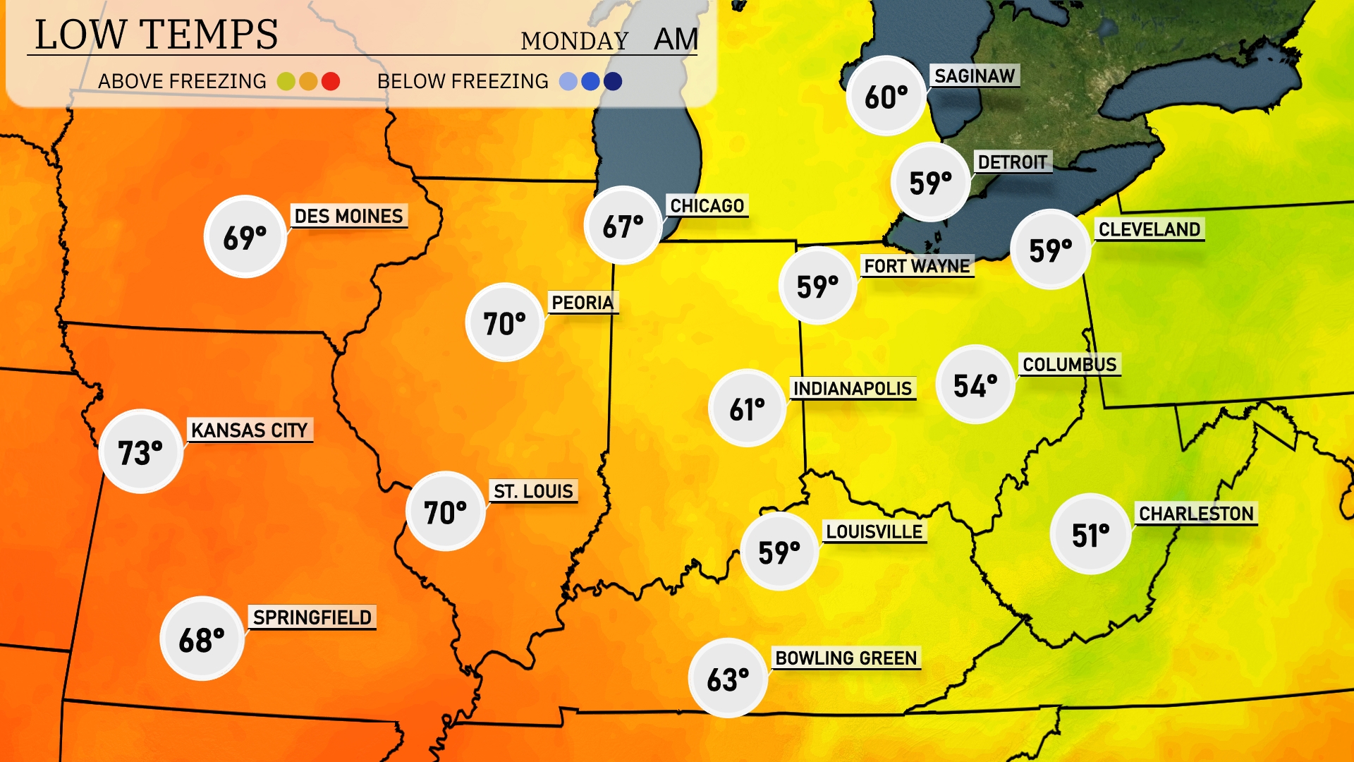 Tonight Chicago will drop to 67 degrees, while temperatures in Peoria and St. Louis stay warm at 70. Indianapolis will cool down to 61 degrees, and Columbus hits a low of 54 degrees. Fort Wayne and Detroit are looking at 59 degrees for the night. The cool spot is Charleston, West Virginia, at 51 degrees.