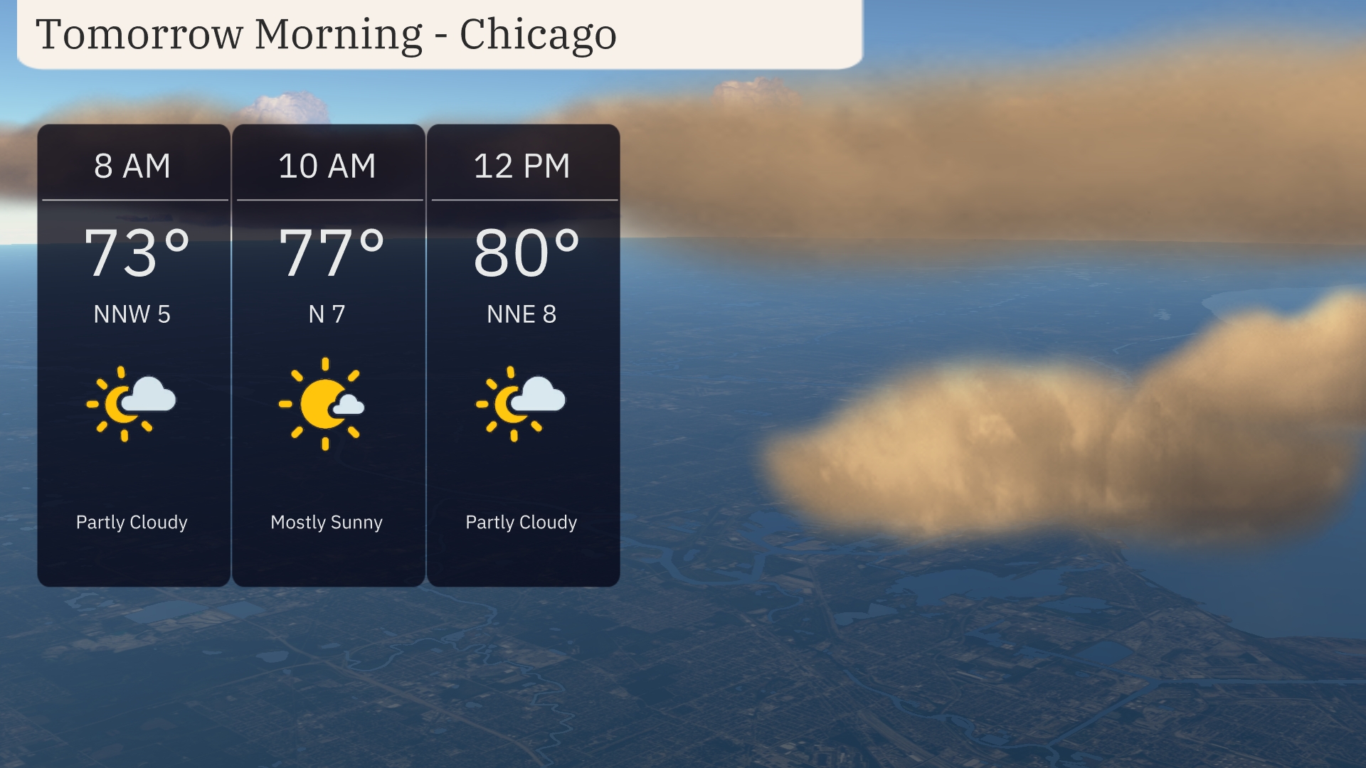 In Chicago tomorrow morning, temperatures start at 73 degrees at 8 AM with a partly cloudy sky and a gentle NNW breeze. By 10 AM, expect mostly sunny conditions as temperatures rise to 77 degrees with winds shifting slightly from the north. Approaching noon, the temperature hits 80 degrees, with partly cloudy skies returning and a breeze from the NNE at 8 miles per hour.