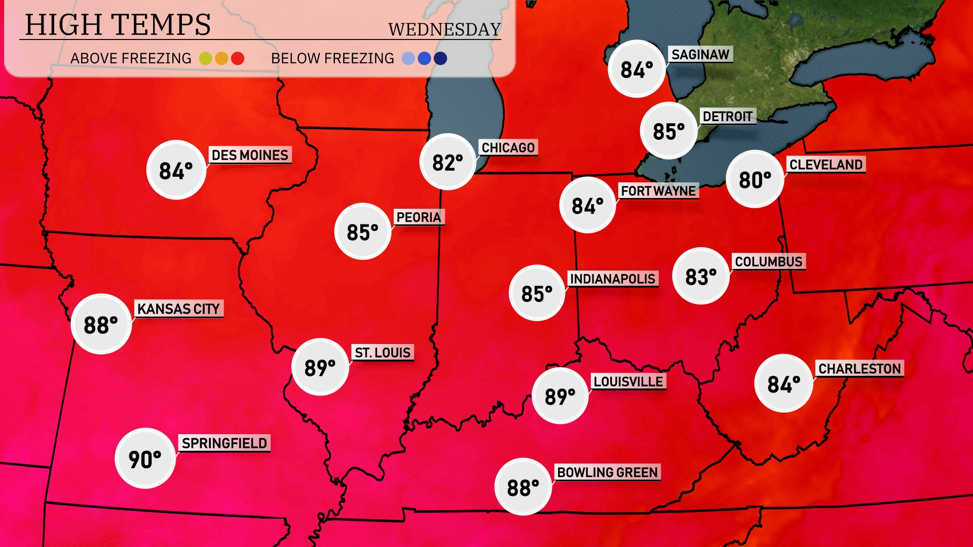 Tomorrow, Kansas City will reach a high of 88 degrees, while St. Louis sees slightly warmer conditions at 89. Springfield is expected to hit a warm 90 degrees, reflecting above-average temperatures for the area. Chicago will enjoy a pleasant 82 degrees, and Indianapolis is forecasted at a comfortable 85. This warm trend in the Midwest is attributed to a ridge of high pressure influencing the region, leading to mostly clear skies and increased sunshine.