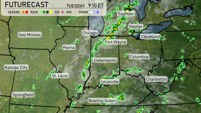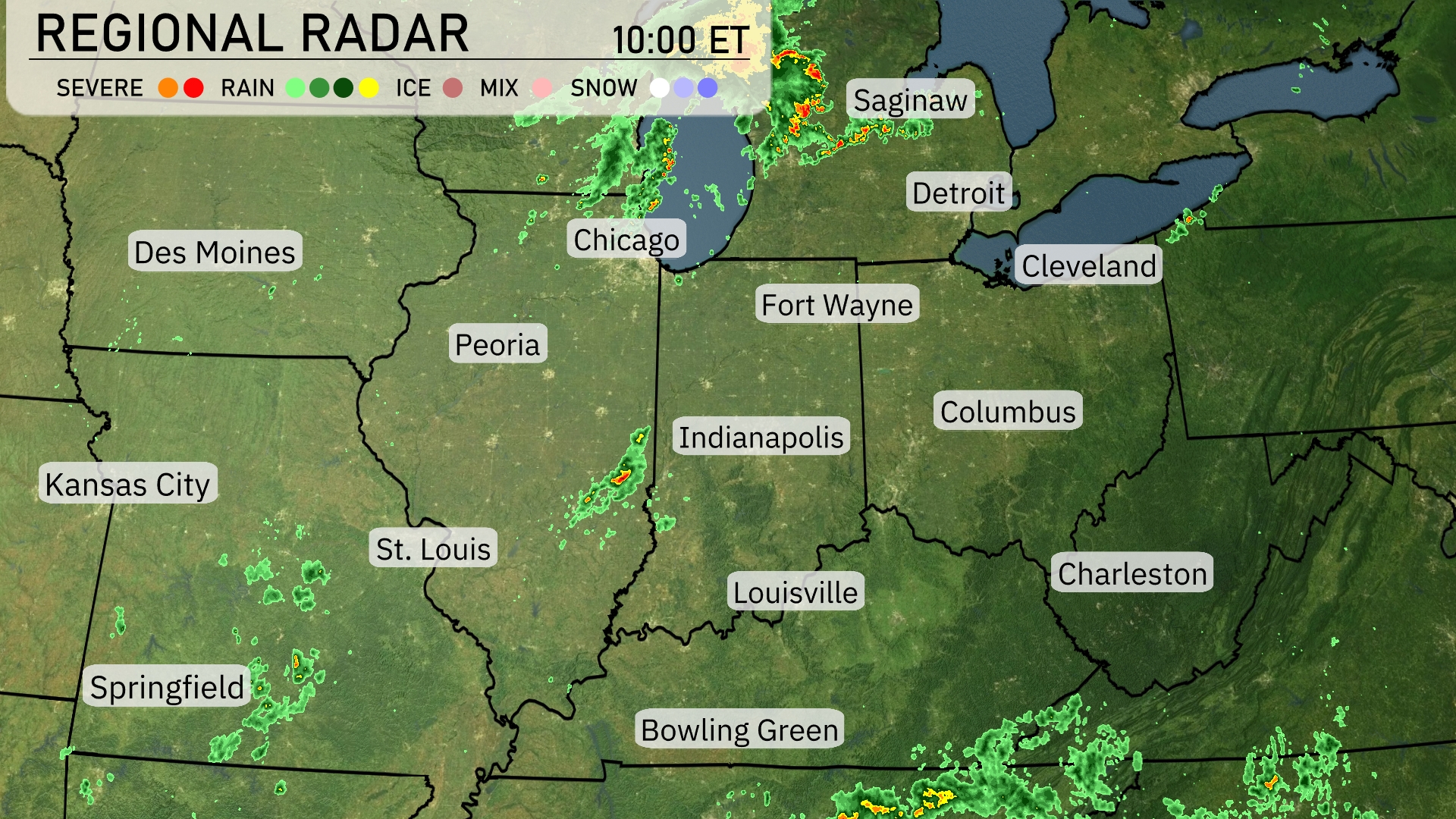 Over the Midwest today, a band of showers is advancing towards Chicago from the west, bringing rain to areas like Des Moines and Peoria. Saginaw is seeing isolated thunderstorms heading its way, adding to the weather excitement in Michigan. Columbus and Indianapolis are experiencing scattered showers with some breaks in the clouds offering occasional glimpses of sun. In the South, storms are bubbling up over Bowling Green, moving northeast, while Cleveland enjoys a relatively clear sky for now.