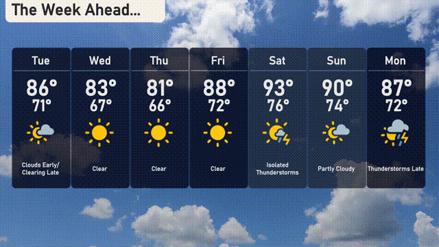 Tuesday: Starting off with clouds early, clearing late in the day, and a high of 86 degrees. The low will be 71 degrees.