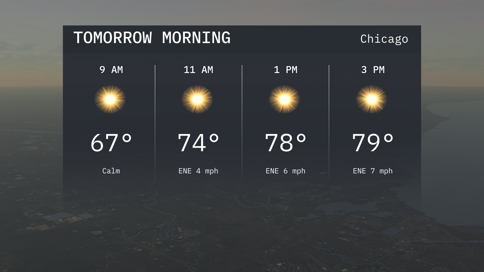 In Chicago, tomorrow morning begins with a calm and sunny outlook. At 9 AM, temperatures are at 67 degrees, with a light breeze picking up from the east-northeast at 4 miles per hour by 11 AM. Expect temperatures to rise to a comfortable 74 degrees by late morning.