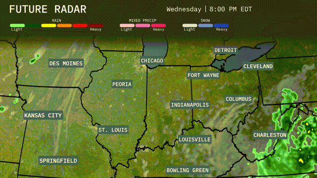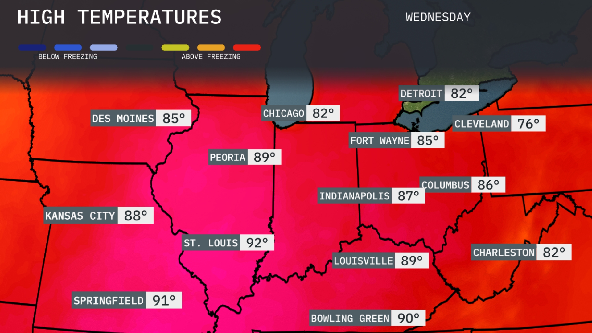 Tomorrow, Springfield will experience a high of 91 degrees, while St. Louis is just behind at 92. Peoria is expected to reach 89 degrees, with Kansas City slightly cooler at 88. Chicago will enjoy a pleasant 82 degrees, and Indianapolis is forecasted to hit 87. These temperatures are well above average for this time of year, influenced by a dominant warm air mass across the region.