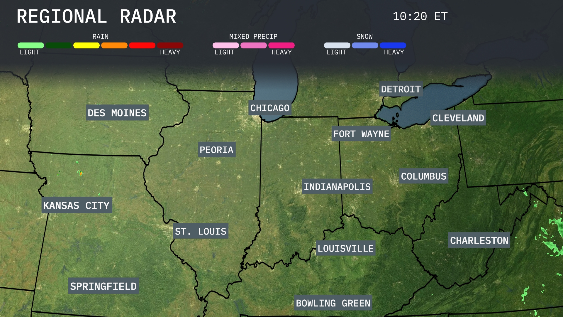 A tranquil canvas is painted across most of the Midwest with clear skies reigning over cities like Chicago, Indianapolis, and Cleveland. However, spotty showers are taking a gentle stroll across Kansas City and Springfield—nothing too fierce, yet might need those umbrellas handy. Des Moines and St. Louis are enjoying a break under dry conditions. Keep an eye on the light rain pushing southeast from the Great Lakes, as areas around Detroit might see some scattered showers later.
