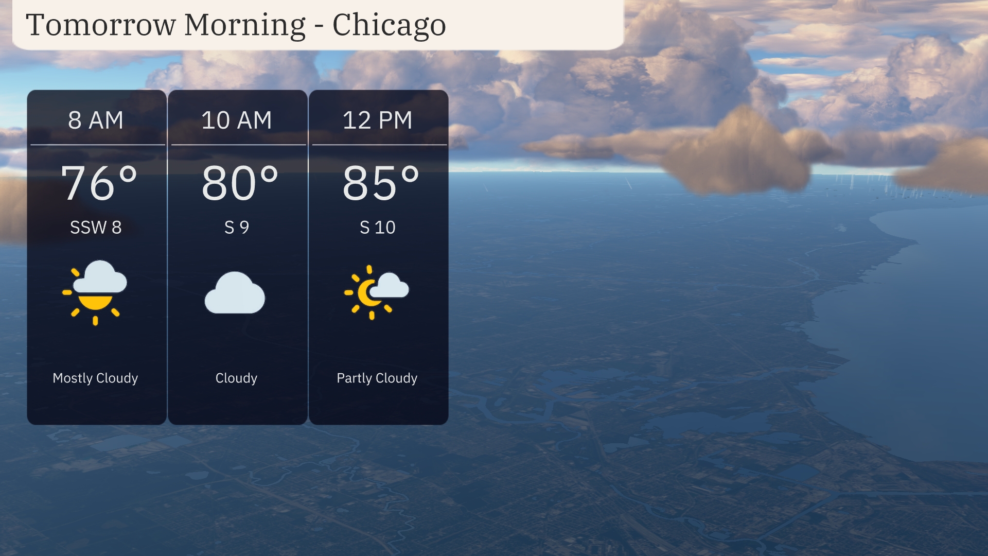 Chicago will start the morning with partly cloudy skies and a temperature of 76 degrees at 8 AM, accompanied by a gentle southwest wind at 8 mph. Moving into the morning, clouds will increase by 10 AM with temperatures reaching 80 degrees and winds shifting to the south at 9 mph. By midday, look for a mix of sun and clouds with a temperature of 85 degrees and a steady south wind at 10 mph.