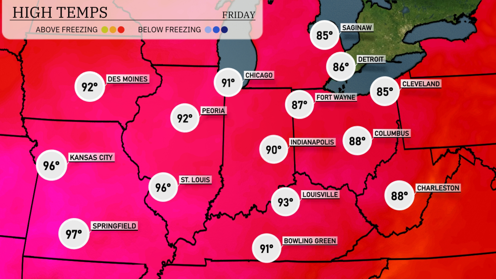 Tomorrow in the Midwest, temperatures are soaring, with Kansas City expecting a high of 96 degrees. St. Louis and Springfield will experience similarly warm conditions, reaching 96 and 97 degrees, respectively. Peoria and Indianapolis are not far behind, with highs of 92 and 90 degrees. Chicago will see a pleasant day at 91 degrees, while Fort Wayne is forecasted to hit 87 degrees.