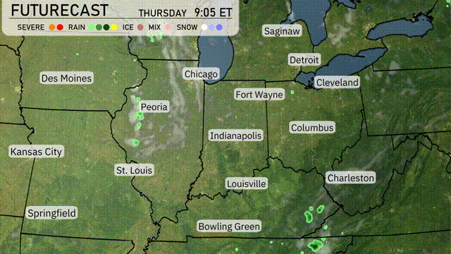 A warm front is moving steadily over the Midwest, with scattered thunderstorms developing mainly in areas like Peoria and Indianapolis by late morning. As we move into the afternoon, expect those storms to intensify, bringing the possibility of heavy rainfall and localized flooding, particularly in Fort Wayne and Columbus. Temperatures will remain warm across the region, hitting the upper 80s to low 90s in St. Louis and Bowling Green. Overnight, a more organized line of storms could shift eastward across Cleveland and Charleston, increasing the risk of wind gusts and thunderstorm activity. Cooler and drier air will settle in early Friday, providing some relief and clearer skies for the weekend.