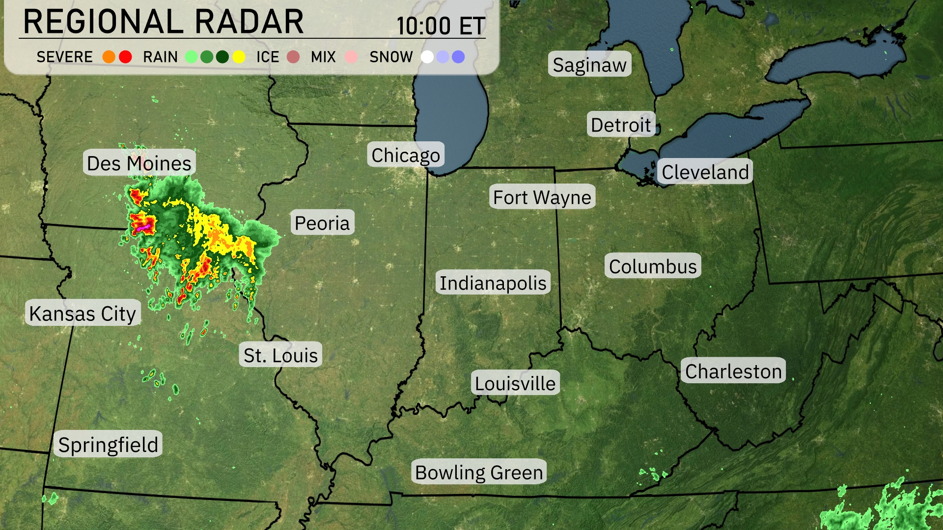 A line of thunderstorms is making its way across Iowa, approaching Des Moines from the west and stretching towards Kansas City. Peoria and St. Louis are under cloudy skies with rain showers beginning to develop. Light rain is showing up in Bowling Green and to the north of Springfield. The rest of the Midwest, including cities like Chicago and Indianapolis, is enjoying clear skies for now, but keep an eye on the skies as weather conditions may change.