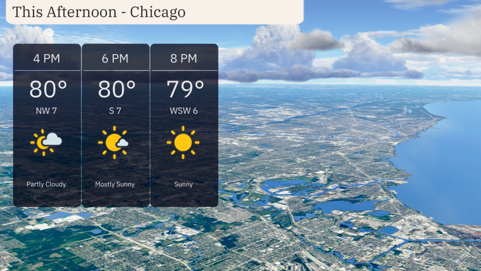 Afternoon temperatures in Chicago remain steady at 80 degrees with mostly sunny skies. Wind shifts from the northwest at 7 miles per hour to the south at 7 miles per hour by 6 PM, bringing comfortable breezy conditions. As the evening approaches, expect temperatures to slightly dip to 79 degrees with clear skies continuing. Enjoy the sunnier weather with light winds from the west-southwest at 6 miles per hour.