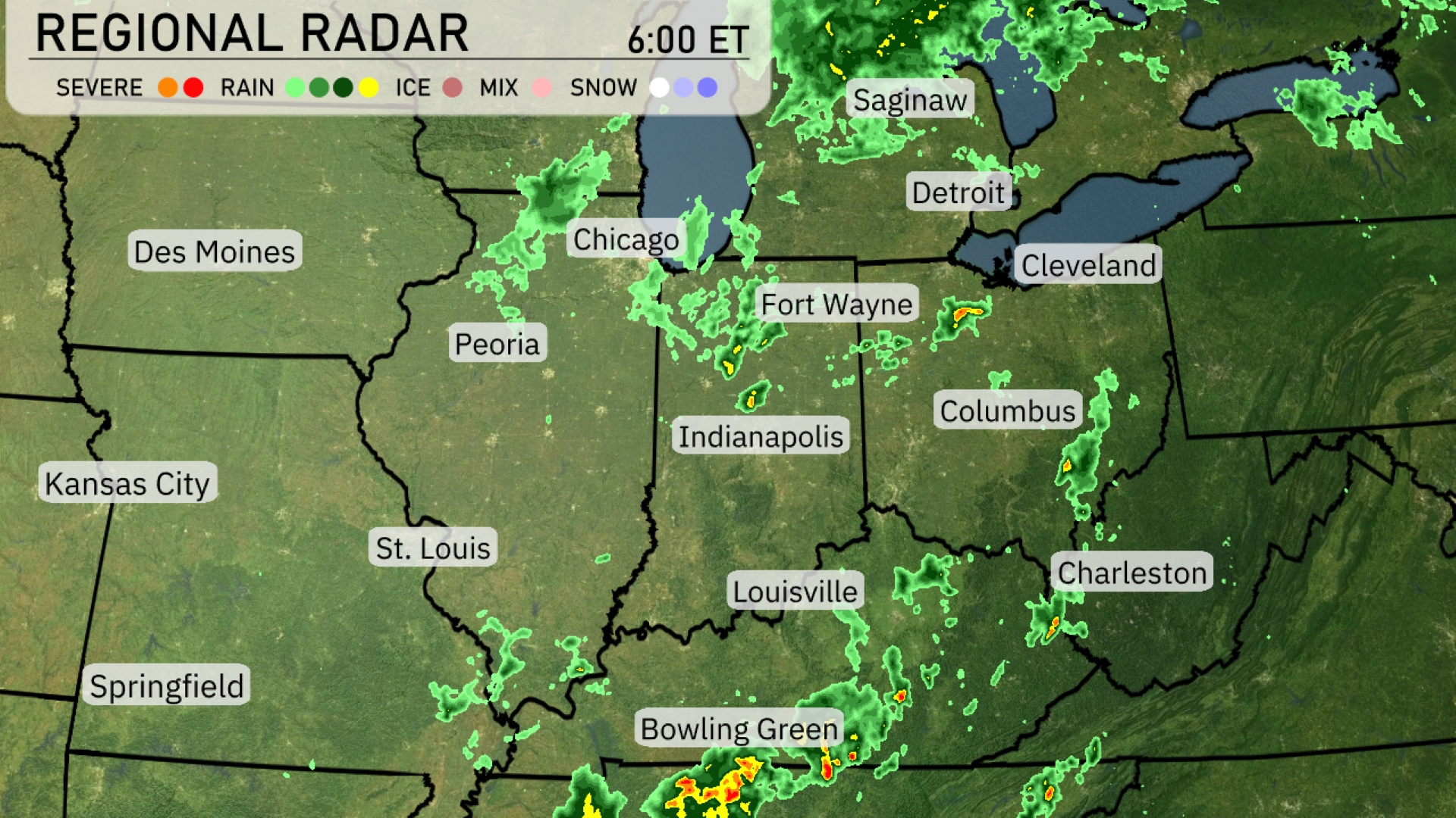 A line of showers and thunderstorms is extending from Bowling Green moving toward Louisville and Indianapolis. More isolated showers and storms are seen around Fort Wayne, descending southeast toward Columbus. Chicago and Des Moines are enjoying dry conditions, while rain is diminishing around the Detroit area. Light to moderate rain showers are spreading over Cleveland, heading eastward.