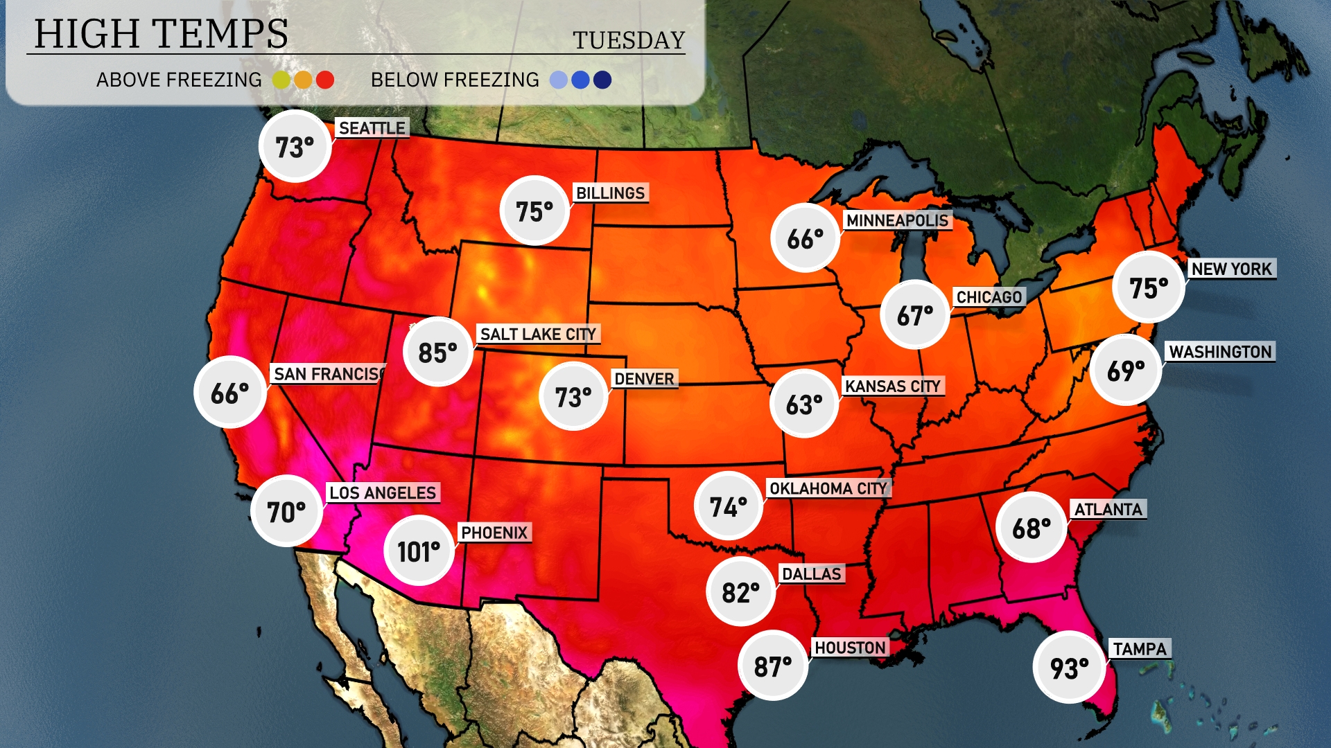 Today, we’re seeing a dramatic range in high temperatures across the United States. In the Southwest, Phoenix is sizzling with a high of 101 degrees, while Los Angeles remains more moderate at 70 degrees. Moving into the Southeast, temperatures are pushing into the 90s, with Tampa experiencing a steamy high of 93 degrees, contrasting sharply with cooler spots like Atlanta at just 68 degrees. Up North, Chicago sits at 67 degrees, while Minneapolis is slightly warmer at 66 degrees. Out in the Rockies, Denver enjoys a pleasant 73 degrees, with Salt Lake City a touch warmer at 85 degrees.