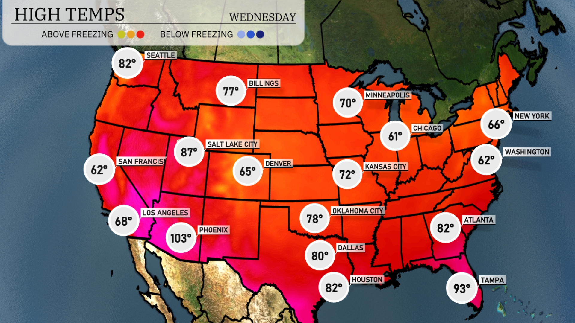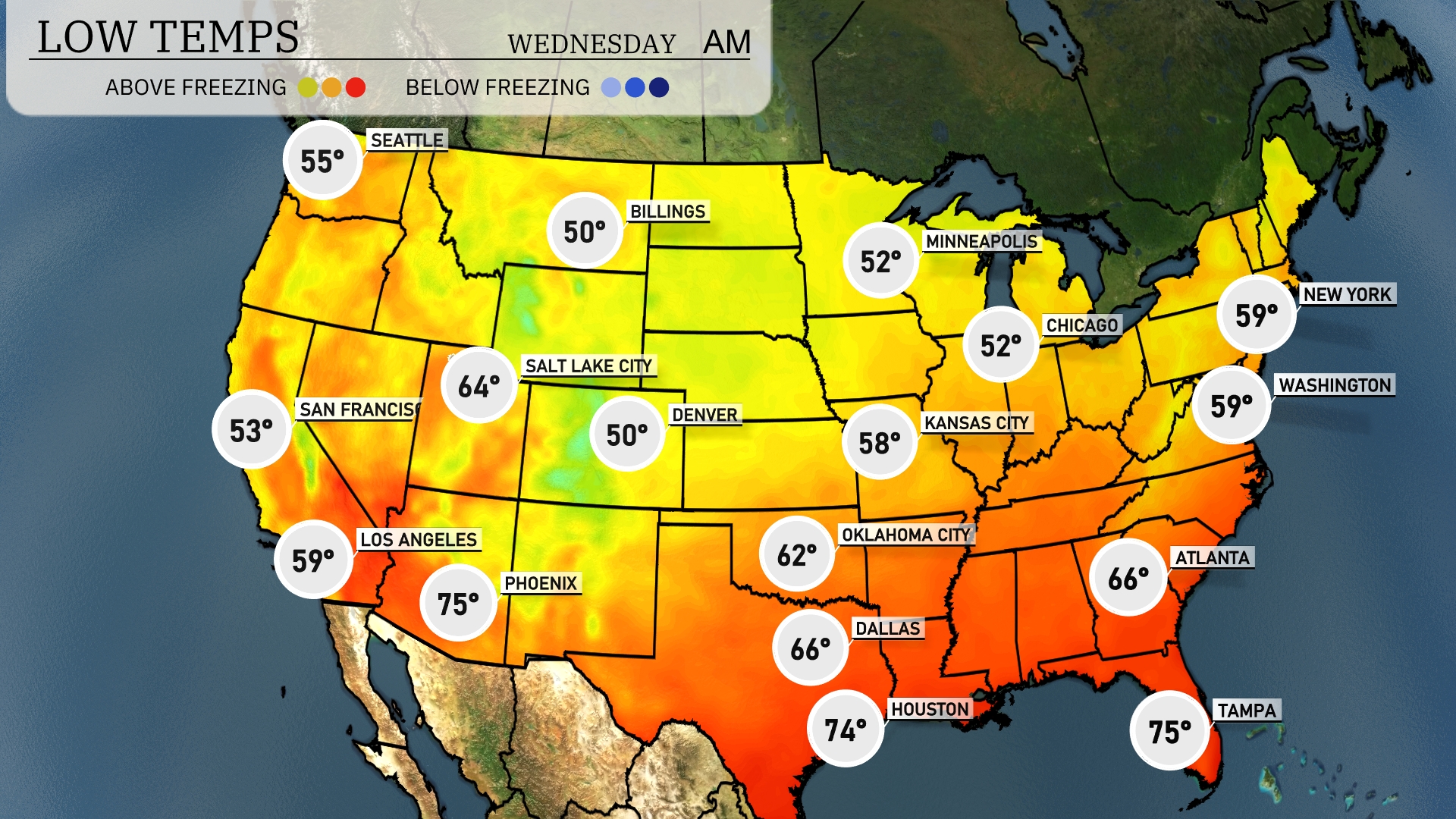 Now for the low temperatures. The northern plains see a chilly morning with 32 degrees in Billings and 30 in Minneapolis. Down in Chicago, expect a low of 52, while Kansas City sits slightly warmer at 58 degrees. Moving south, Dallas will wake up to a mild 66 degrees. In the southeast, Atlanta starts the day at 66, and further south, Miami remains warm with a low of 75 degrees.