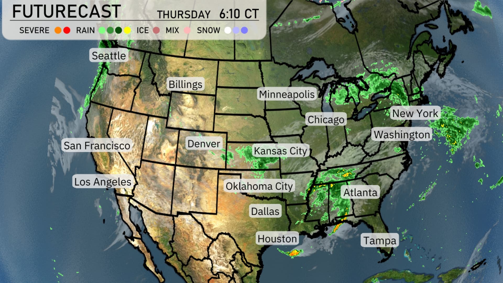 Today, a storm system is putting quite a show across the southern part of the country. As we start from the west coast, Seattle enjoys calmer conditions, while further inland, Billings and Denver remain relatively dry. In contrast, the Southern Plains are experiencing some significant precipitation. Dallas is under the wet spell with heavy rain, while areas around Houston could see thunderstorm activity that could impact travel plans. Moving eastward, the Mississippi Valley, including Memphis, is seeing scattered showers; however, the heaviest precipitation extends towards the Great Lakes. Look out for rain bands around Minneapolis, bringing wet conditions throughout the day. The Midwest from Kansas City to Chicago is also experiencing rain, so keep those umbrellas handy. Farther into the Southeast, cities like Atlanta and Charlotte are seeing an uptick in rain coverage as the day progresses. In the Mid-Atlantic, Washington, D.C. faces scattered showers yet again. A clear picture paints Florida, where Tampa escapes most of the rain, making it a good day for outdoor activities along the coast.