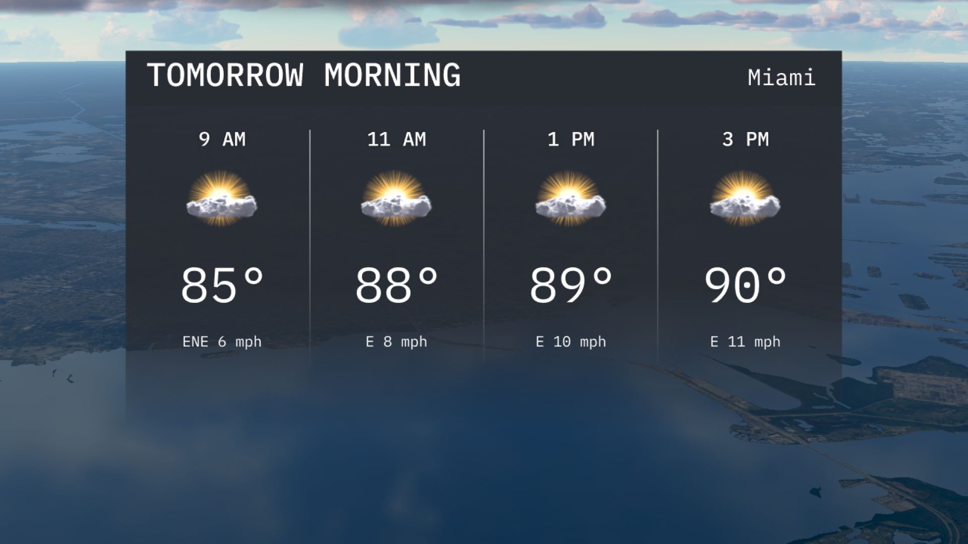 Expect a warm start to your morning in Miami, with temperatures already at 85 degrees by 9 AM. Winds will be gentle, coming from the east-northeast providing a slight breeze. As the morning progresses, temperatures rise to 88 degrees by 11 AM, accompanied by a light east wind. Partly cloudy skies will dominate, making for a mixed sun and cloud outlook through the morning.