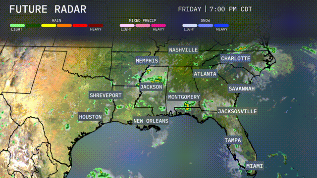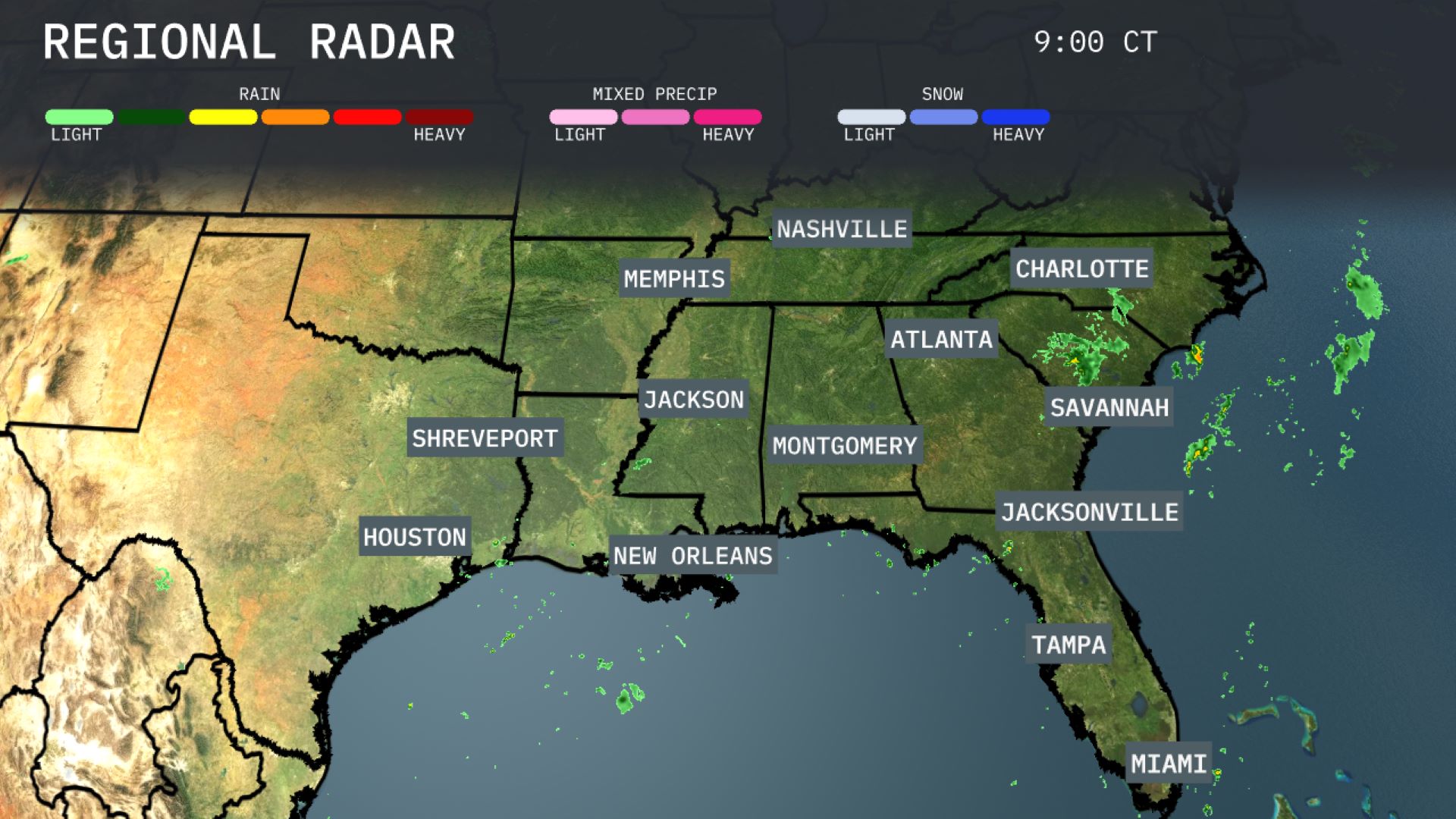 Tomorrow, Atlanta will see a high of 72 degrees, slightly below average for this time of year. Nashville is expected to reach 73 degrees, while Memphis hits 76. Shreveport will enjoy a warm 77 degrees. Over in Houston, a balmy 81 degrees is on the horizon, making it the warmest major city in the Southeast. Expect highs around 78 in New Orleans and Jacksonville, contributing to a warm trend across the region.