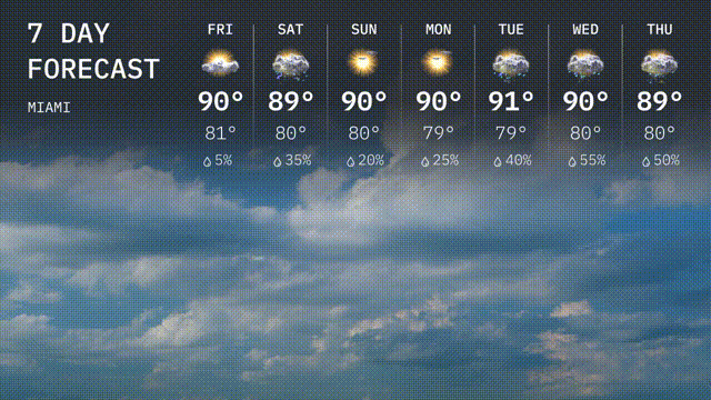 Friday: Look for partly cloudy skies with a high of 90 degrees and a balmy low of 81 degrees. Saturday: Expect more clouds with occasional sun, highs reaching 89 degrees and dropping to 80 degrees at night. Sunday: A mostly sunny day is in store, peaking at 90 degrees with a low near 80 degrees. Monday: Partly sunny conditions continue, with the thermometer reaching 90 degrees and a low of 79 degrees. Tuesday: A mix of clouds and sunshine, expect 91 degrees for the high and 79 degrees overnight. Wednesday: Scattered showers are likely, with temperatures climbing to 90 degrees and a low of 80 degrees. Thursday: The chance of showers increases, with a high of 89 degrees and a nighttime low of 80 degrees.