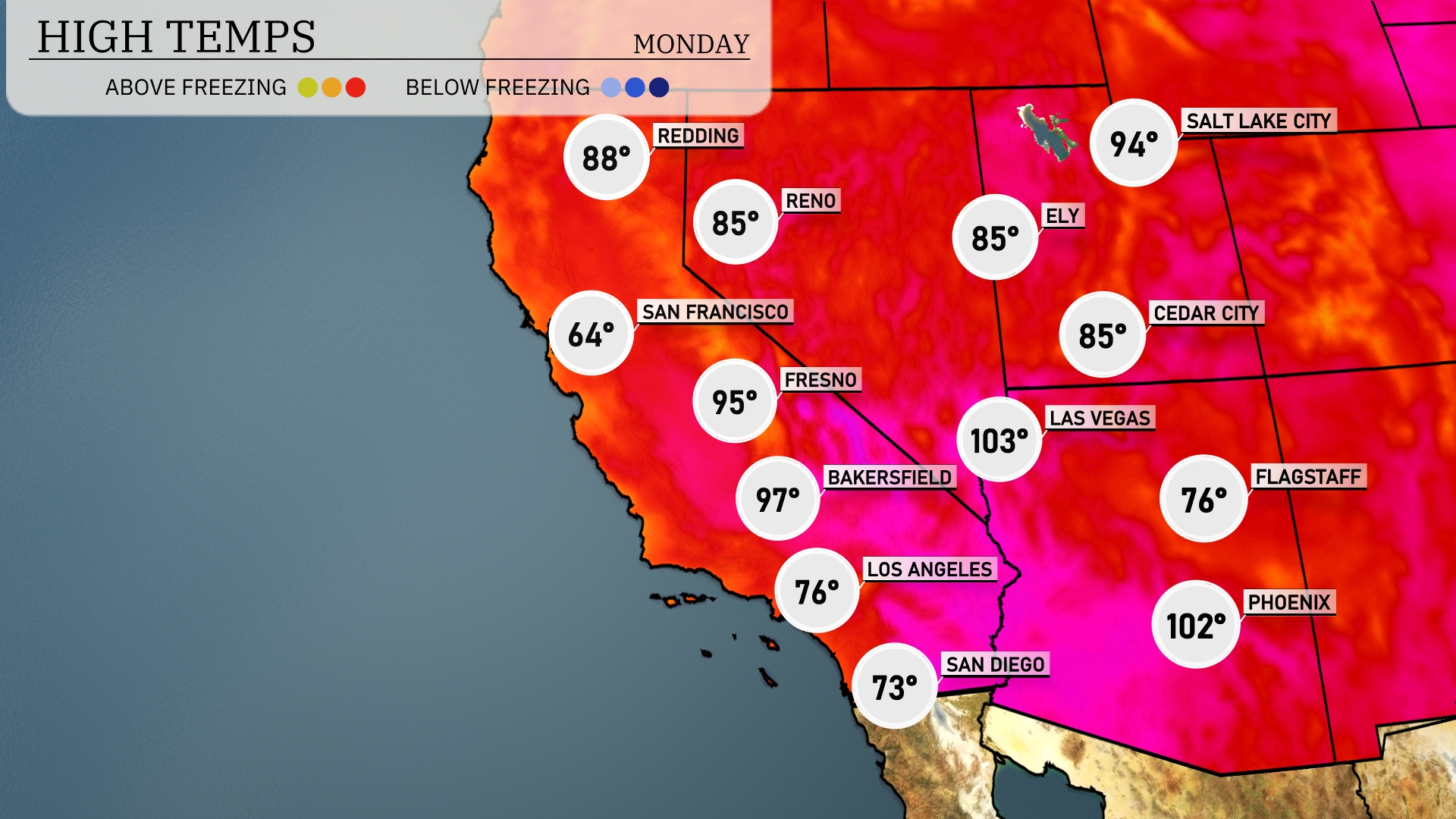 Today in the Southwest, we’re seeing some sizzling temperatures. Las Vegas will heat up to a scorching 103 degrees, while Phoenix is just a bit cooler at 102. The highs in Fresno and Bakersfield are impressive as well, reaching 95 and 97 degrees respectively. Over in San Diego, temperatures will remain more moderate, topping out at 73 degrees. Flagstaff is experiencing a notable contrast with a high of just 76, providing a cooler retreat from the heat.