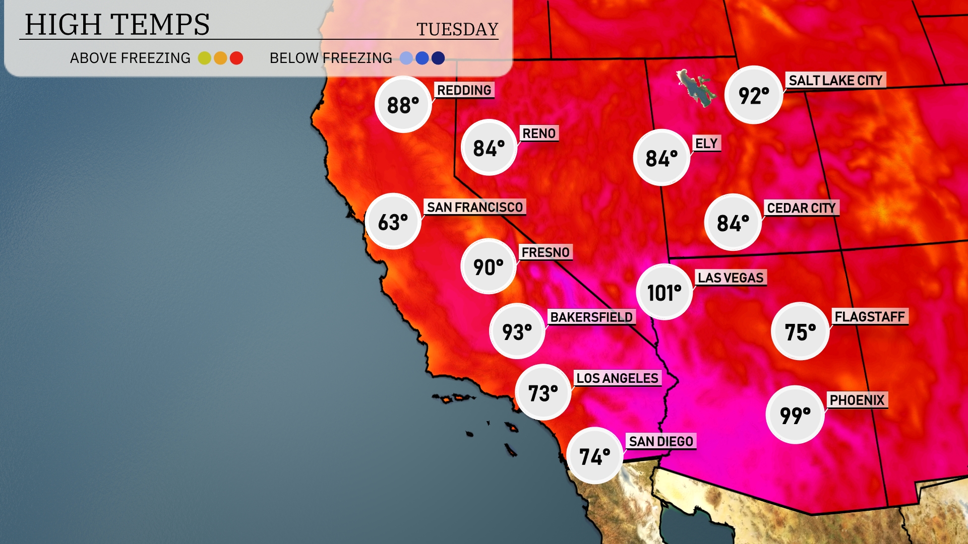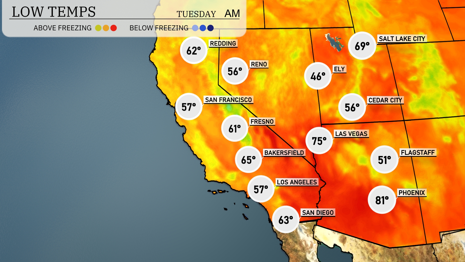 Tonight, Las Vegas will see a low of 75 degrees, while Phoenix stays warmer at 81. Flagstaff is expected to drop to a brisk 51 degrees, marking a notable chill for the region. San Diego will cool down to 63 degrees, and Bakersfield is forecasted to hit 65 tonight.