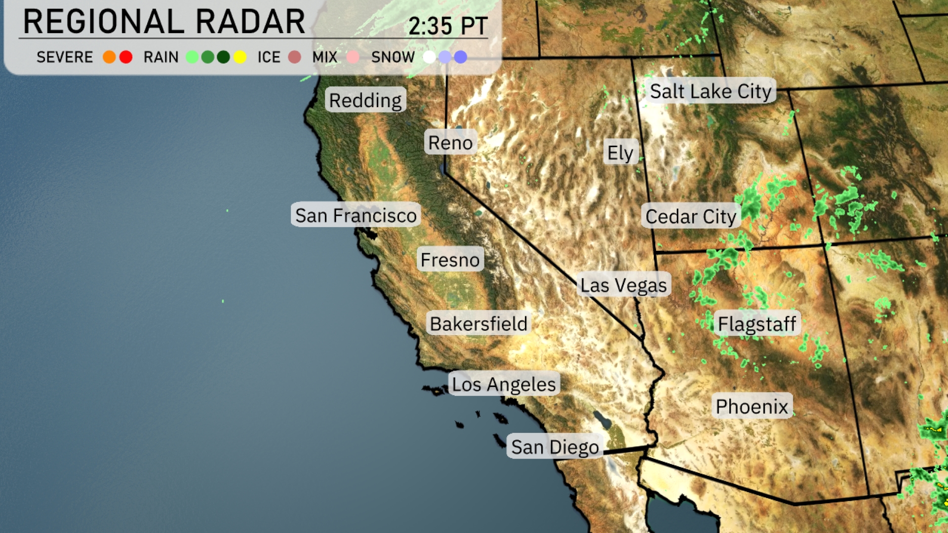 A cluster of showers and thunderstorms is visible over eastern Arizona near Flagstaff, extending towards Cedar City. Expect some light rain to continue in these areas throughout the day. The cities including San Francisco, Las Vegas, and the entire Southern California coast are enjoying clear skies. Ely and Reno remain dry as patches of cloud cover are observed nearby, with no significant precipitation expected.