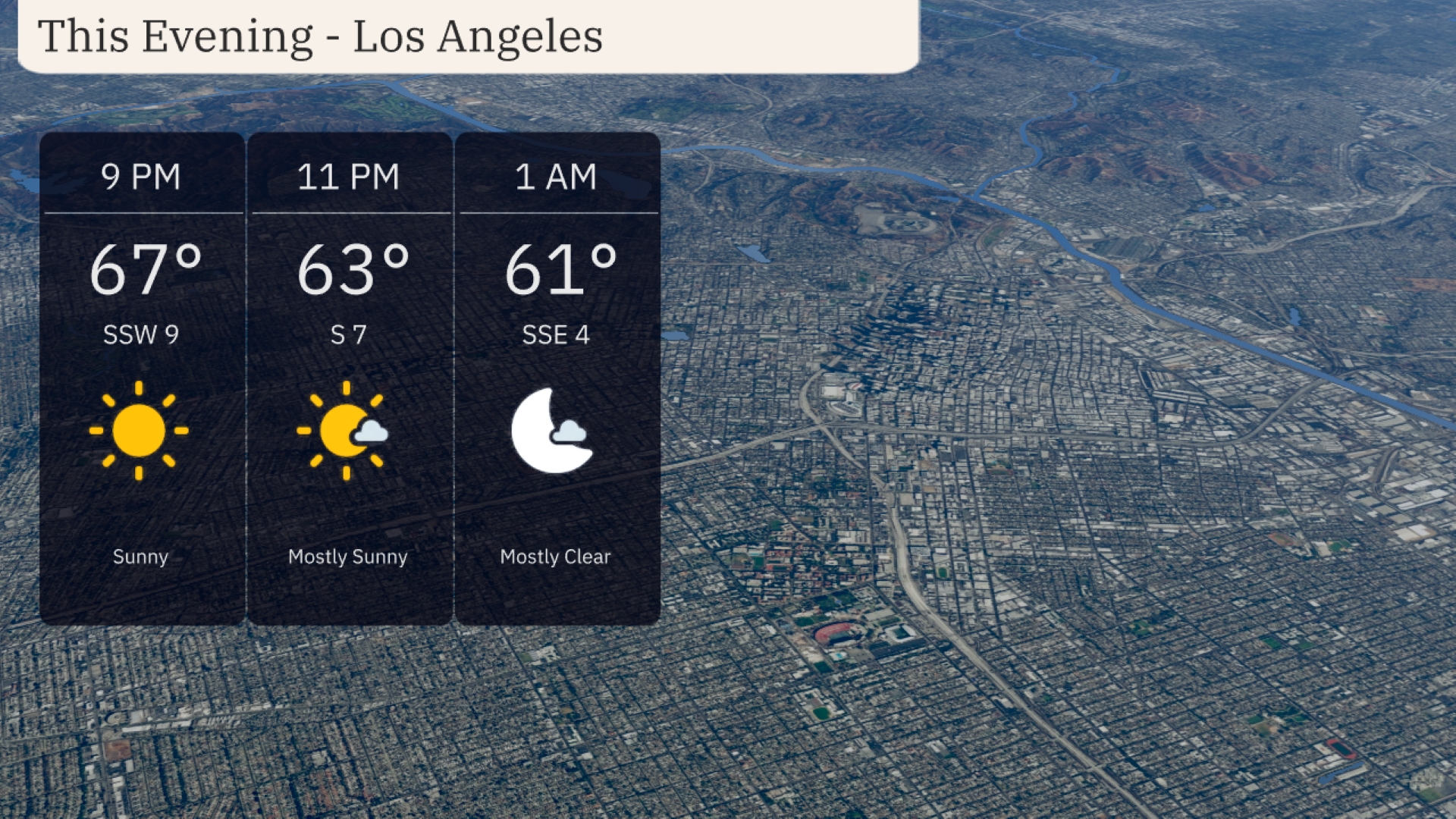 Evening temperatures in Los Angeles will start at 67 degrees at 9 PM, slowly cooling to 61 degrees by 1 AM. Winds from the south-southwest at 9 mph will ease to 4 mph from the south-southeast.