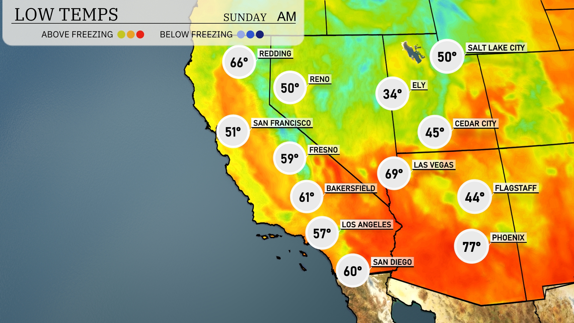 Tonight, Phoenix will remain warm at 77 degrees, while Las Vegas cools down to 69 degrees. In Flagstaff, expect a chilly low of 44 degrees, and Ely will see a brisk drop to 34 degrees. Over in Cedar City, temperatures will settle around 45 degrees, and Redding will be cooler at 50 degrees.