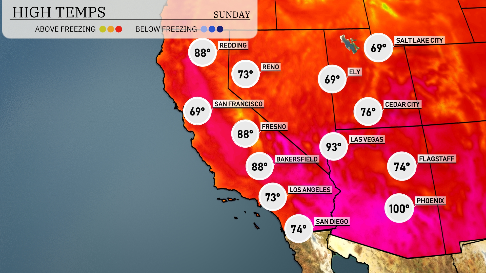 Tomorrow in Phoenix, prepare for a scorching high of 100 degrees, significantly above average. Las Vegas is also heating up, expected to reach 93 degrees. Bakersfield and Fresno will both hit 88, aligning with warmer trends in the Central Valley. San Diego will see milder conditions with a high of 74 degrees, while Los Angeles warms up to 73. Temperatures will be influenced by a strong ridge of high pressure settled over the Southwest, enhancing those summer-like readings.