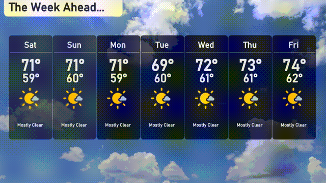Sunday: The pattern continues with mostly clear skies and temperatures peaking at 71 degrees, cooling to 60 degrees overnight.