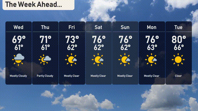 Saturday: Mostly clear skies continue, with a daytime high of 76 degrees and a nighttime low of 62 degrees.