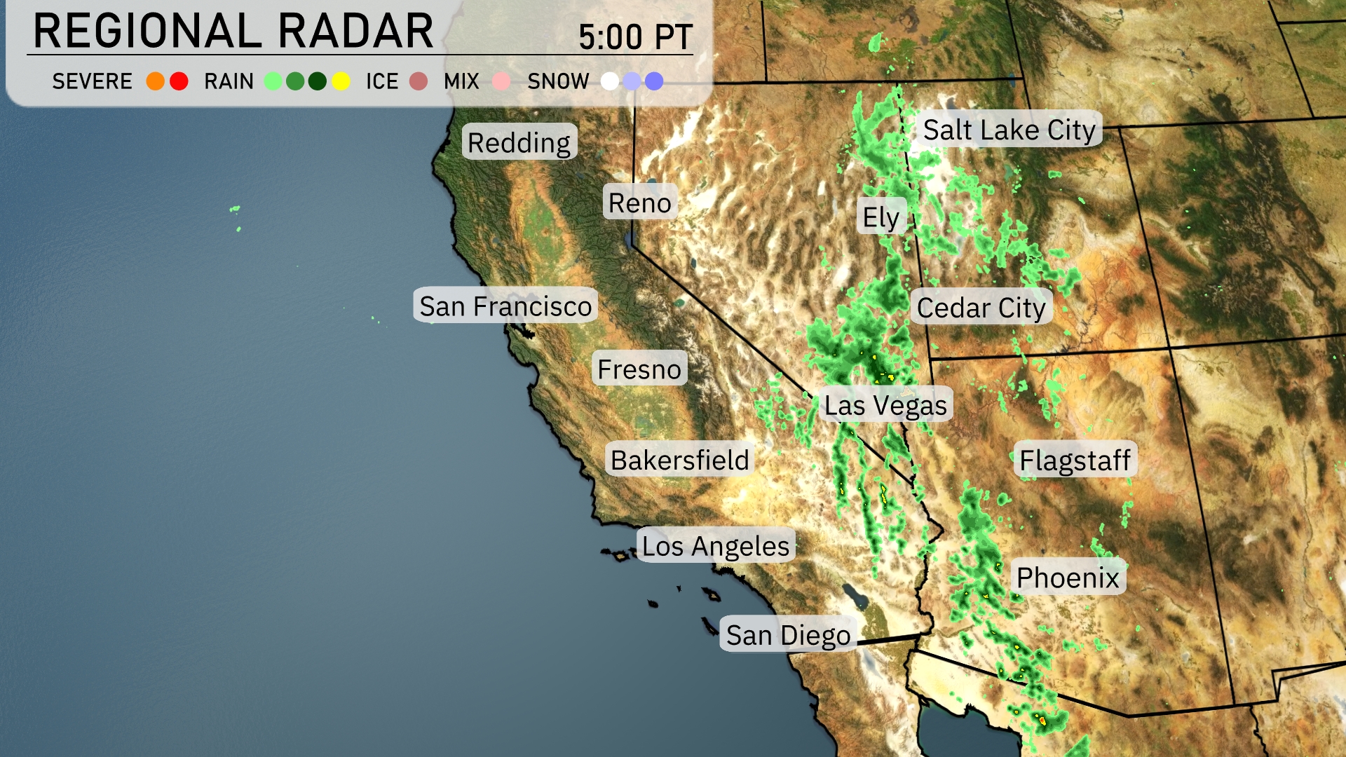 A swath of rain showers is sweeping across the high desert from Ely, Nevada, down through Cedar City, Utah, bringing wet conditions to these areas. Flagstaff is also under the influence of light rain, while Salt Lake City experiences another band of showers moving through. Phoenix and Las Vegas remain dry, showing clear conditions around their urban centers. The coastal cities like San Francisco and San Diego are enjoying clearer skies with no immediate precipitation.