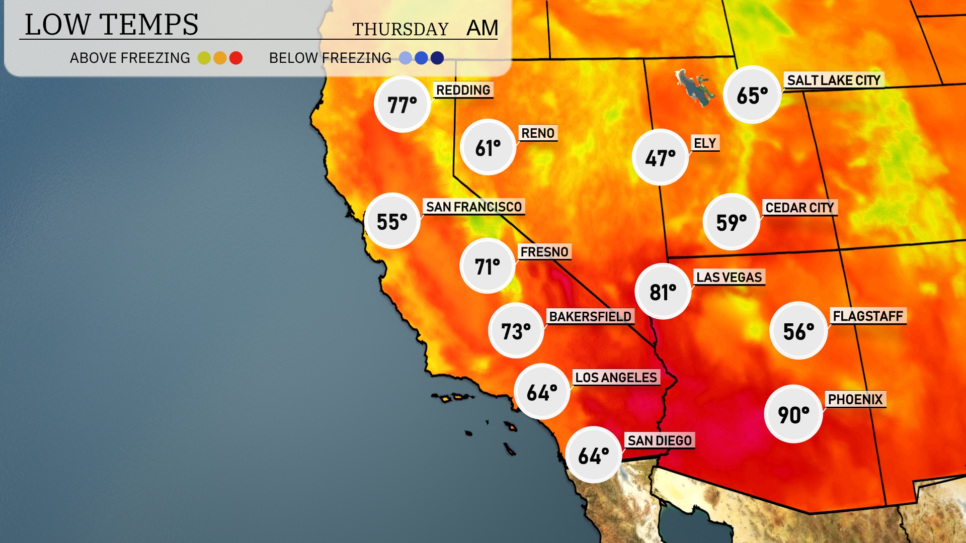 Tonight, temperatures will drop significantly across the Southwest region. Las Vegas will see a low of 59 degrees, while Phoenix remains warm at 90 degrees. Flagstaff is expected to chill to 56 degrees, and San Diego will cool down to 64. Expect cooler nights ahead, especially in the higher elevations.