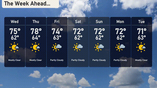Wednesday: Mostly clear with a high of 75 degrees and a low of 62 degrees.