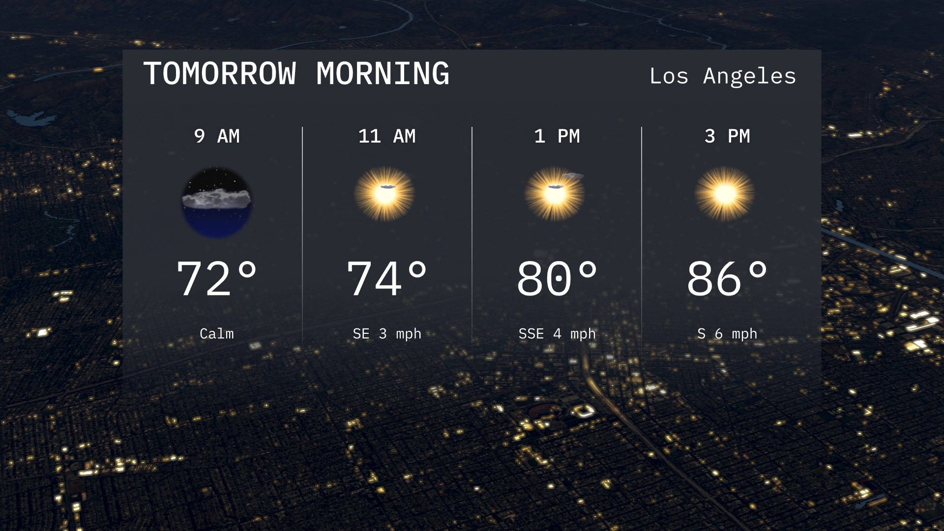 In Los Angeles tomorrow morning, expect a pleasant start with temperatures at 72 degrees by 9 AM. The skies will become mostly sunny as the morning progresses with temperatures reaching 74 degrees by 11 AM. Winds will be light from the southeast, ensuring a calm and enjoyable morning atmosphere.