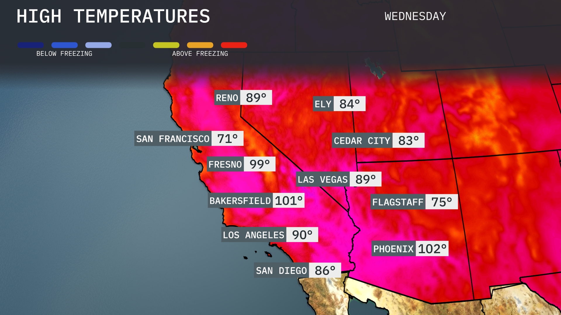 Tomorrow, Bakersfield will soar to a sizzling 101 degrees, making it one of the hottest spots in California. Fresno isn’t far behind, with a high reaching 99 degrees. In Las Vegas, expect a warm day with temperatures peaking at 89 degrees, while Phoenix will hit a remarkable 102, well above average for this time of year. Farther west, San Diego is looking at a pleasant 86 degrees.