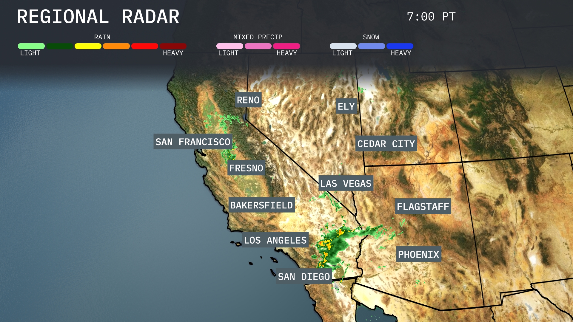 Southern California is seeing active weather, and a storm system is causing widespread rain from San Diego up through Los Angeles, bringing heavy showers along the coast and inland areas. In the Southwest, Phoenix and Flagstaff are under predominantly clear skies, but Flagstaff should prepare for potential rain as the system moves eastward. Reno and Ely to the north remain mostly dry with just a few clouds, while Cedar City is experiencing light precipitation that could intensify. San Francisco and the Central Valley are mostly clear, with conditions remaining dry.