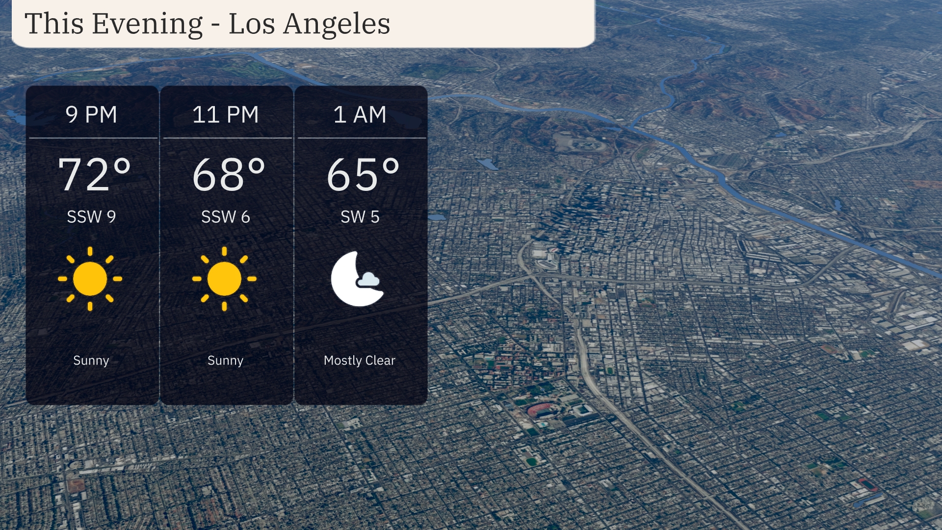 In Los Angeles this evening, anticipate clear skies with temperatures dropping from 72 degrees at 9 PM to 65 degrees by 1 AM. Winds will be coming from the south-southwest, with speeds around 9 miles per hour early in the evening, decreasing slightly to 5 miles per hour by midnight.