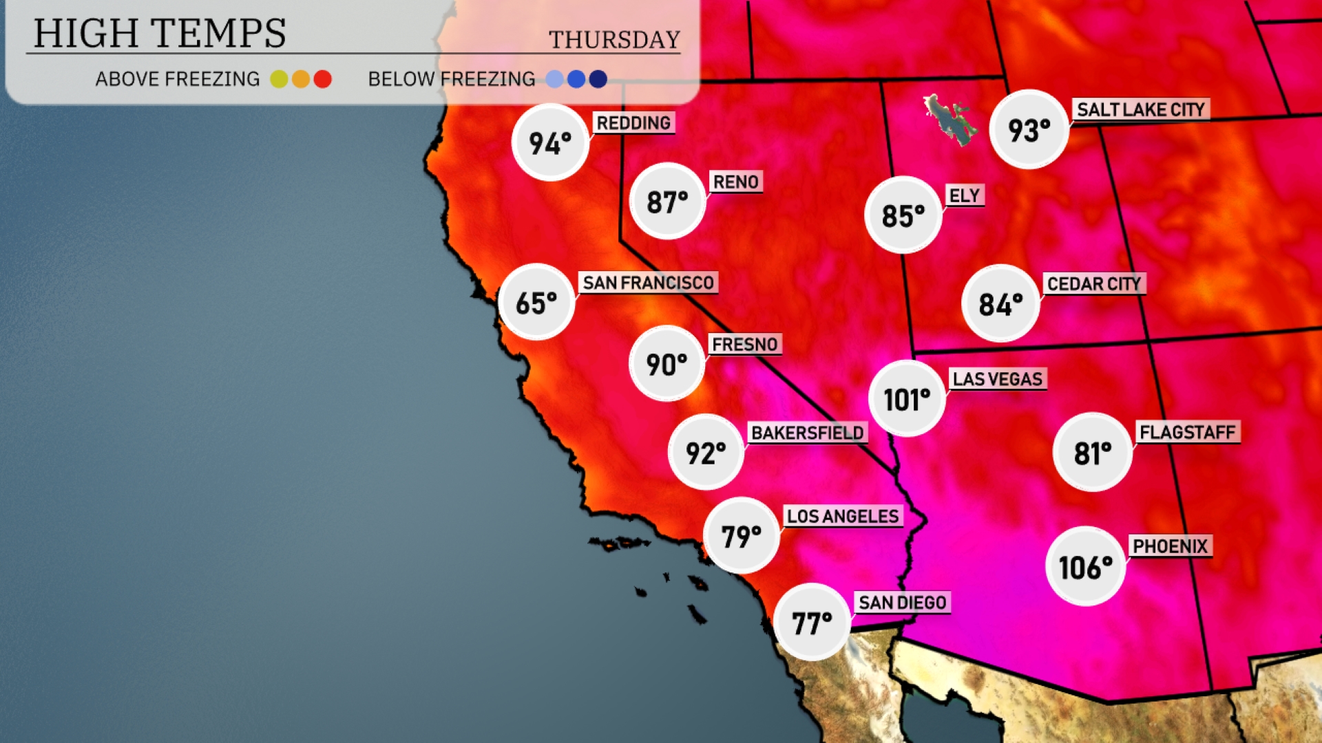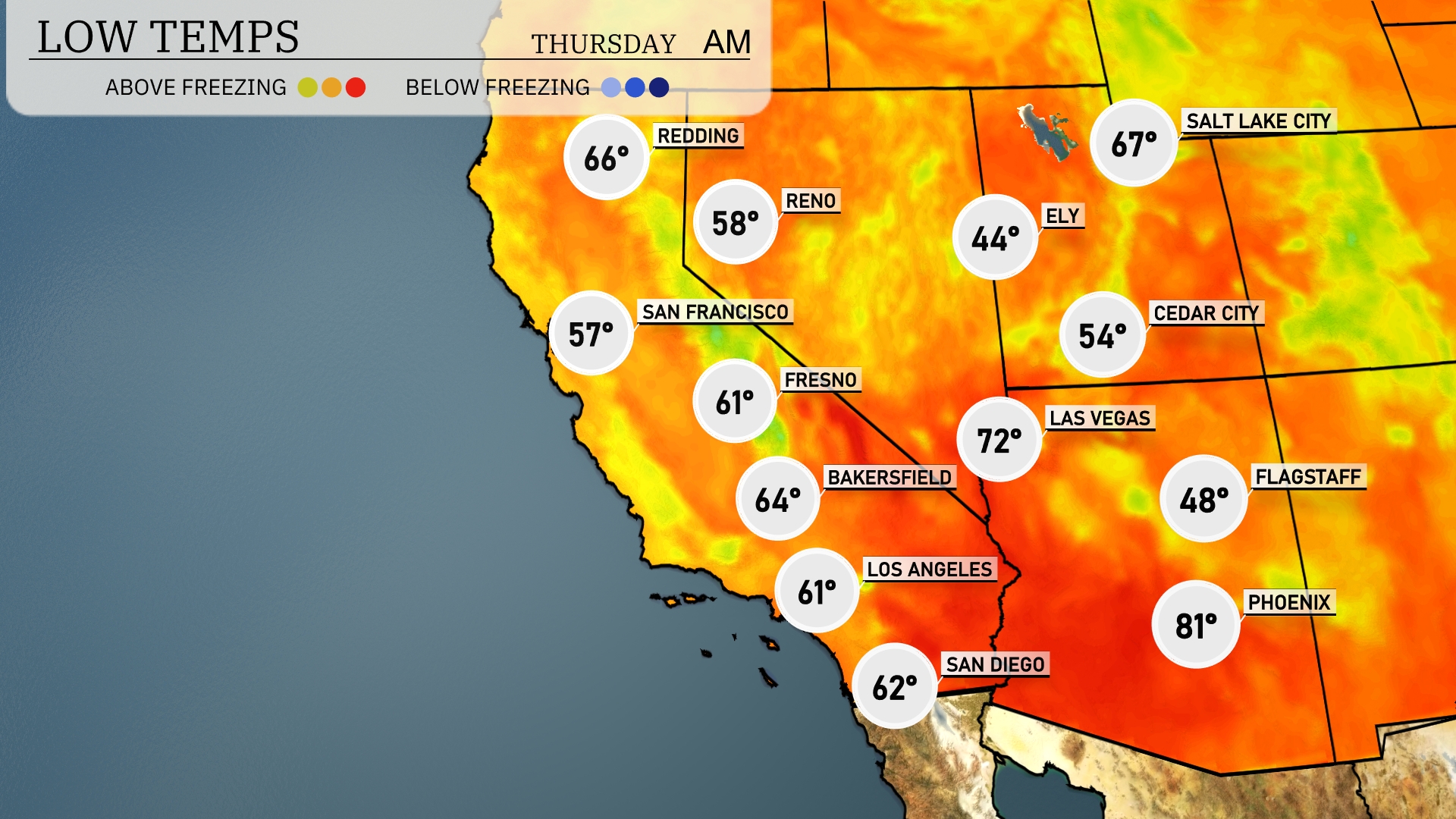 Tonight, Flagstaff dips to a chilly 48 degrees, while Ely will see even colder temperatures at 44 degrees. Las Vegas will remain mild with a low of 72, and Phoenix is expected to cool to 81. San Francisco will settle at 57 degrees, providing a contrast to the colder areas in the region.