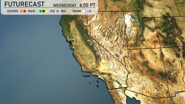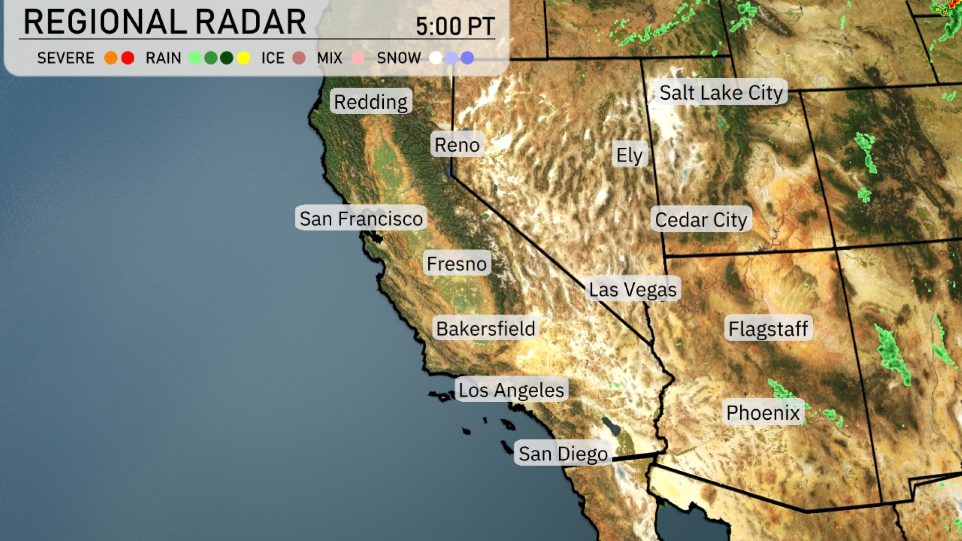 In the Southwest region, the radar indicates mostly clear conditions. Along the coastal areas, especially near San Diego, the skies remain clear and sunny. Central regions near Las Vegas and Bakersfield are experiencing dry conditions with no expected rainfall.