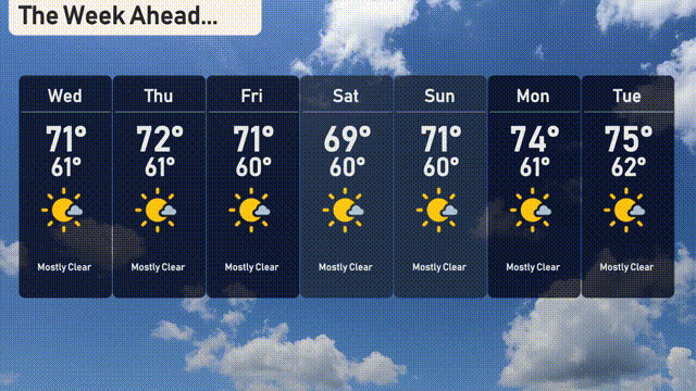 Wednesday: Mostly clear skies with a high of 71 degrees, cooling to 61 degrees overnight.
